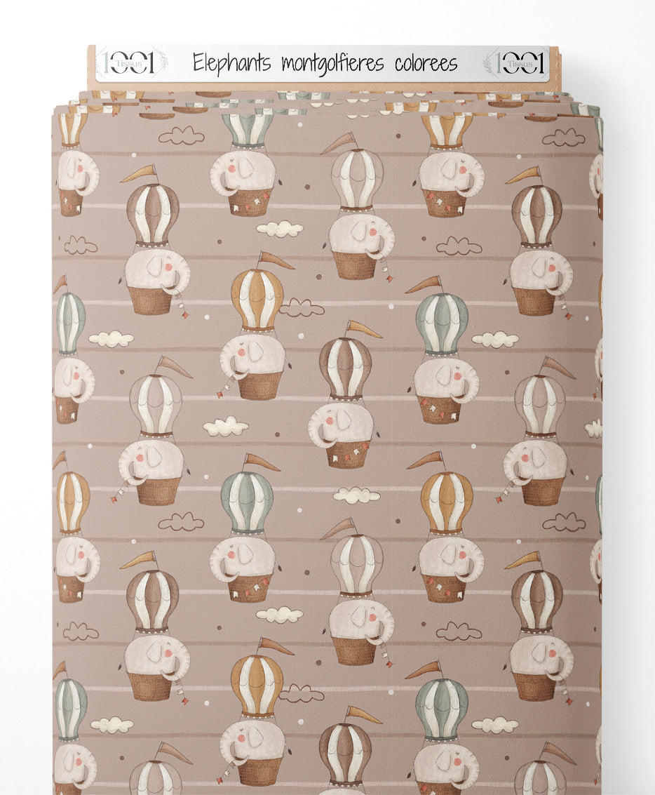 Les montgolfières sont rayées de marron, beige et vert. Les éléphants sont blancs avec des détails roses. De petits nuages et des points blancs ajoutent des éléments aériens.Les tissus