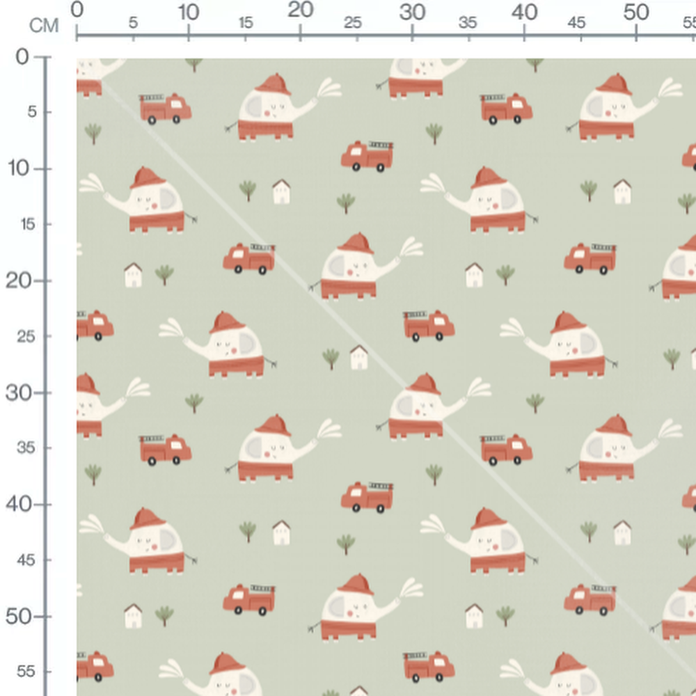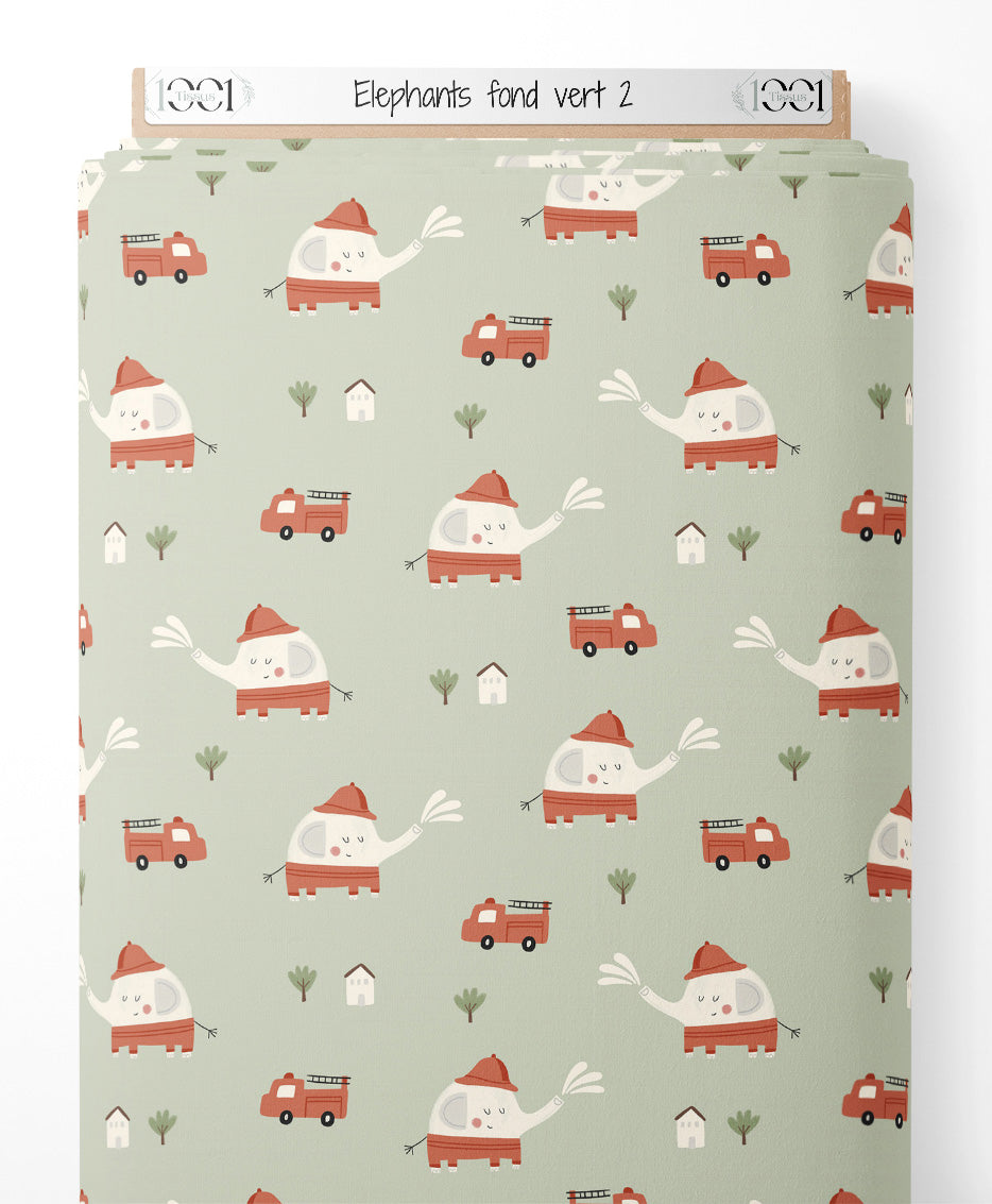Petits arbres verts dispersés entre les éléphants et les camions. Les éléphants portent des tenues assorties aux camions. Les maisons blanches ajoutent un contraste subtil au fond vert.Les tissus