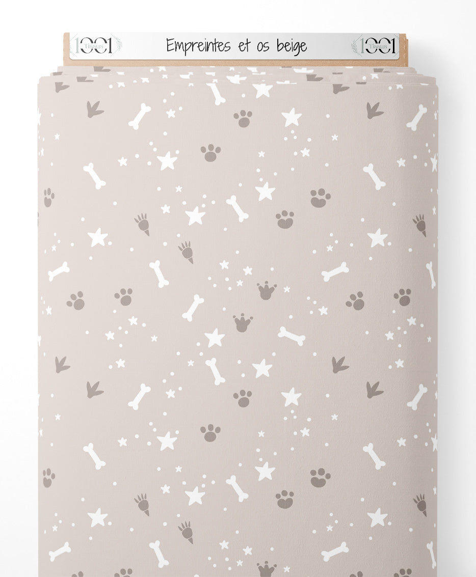 Les empreintes de pattes grises ajoutent une touche ludique. Les os blancs sont dispersés harmonieusement. Des étoiles blanches et des petites traces grises créent un effet de douceur.Les tissus