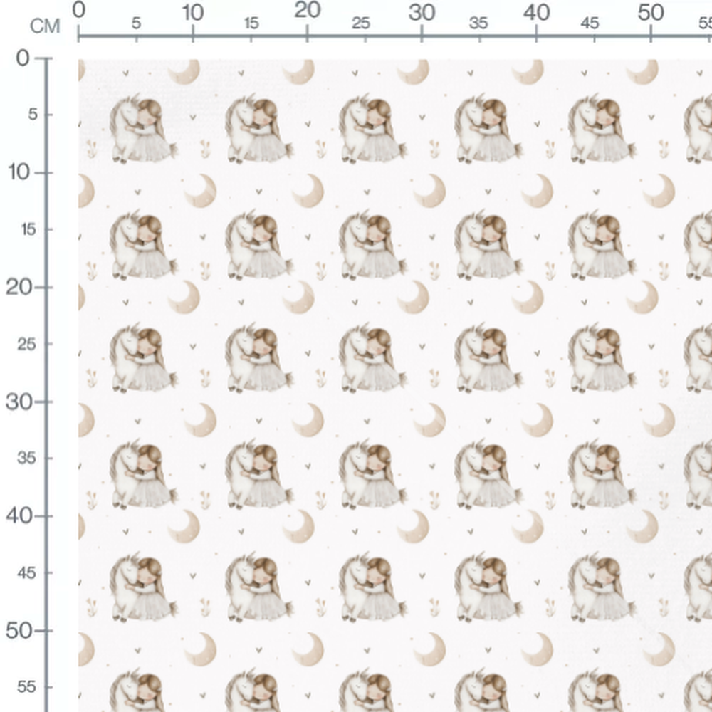 Des fleurs beige et des points gris complètent le motif. La licorne a une crinière grise et une corne dorée. L'enfant porte une robe blanche avec des cheveux bruns.Les tissus