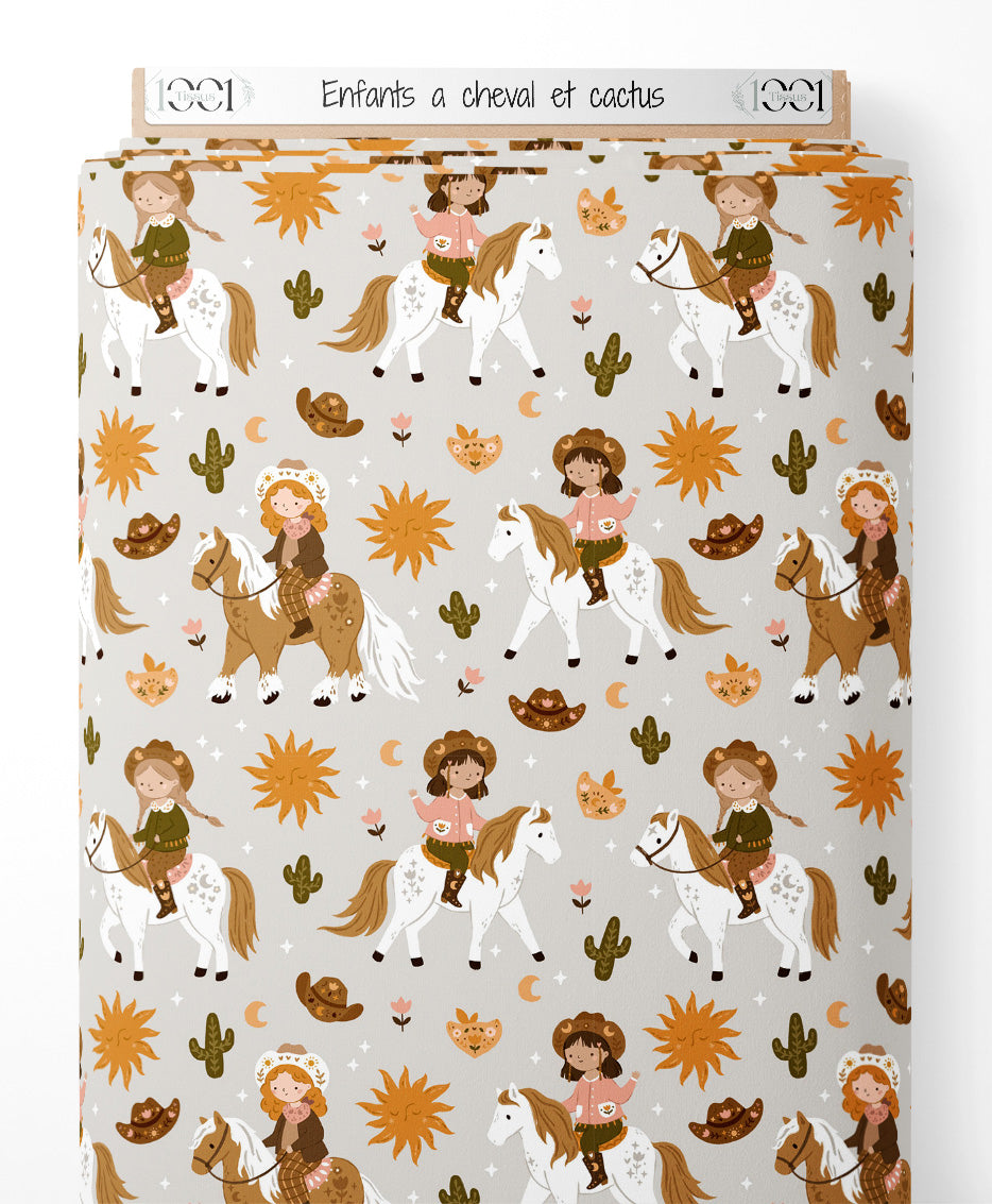 Les enfants portent des vêtements de cow-boy et montent des chevaux. Des motifs de fleurs orange et de petites étoiles blanches complètent le design. Des lunes et des cœurs ajoutent une touche ludique au motif.Les tissus