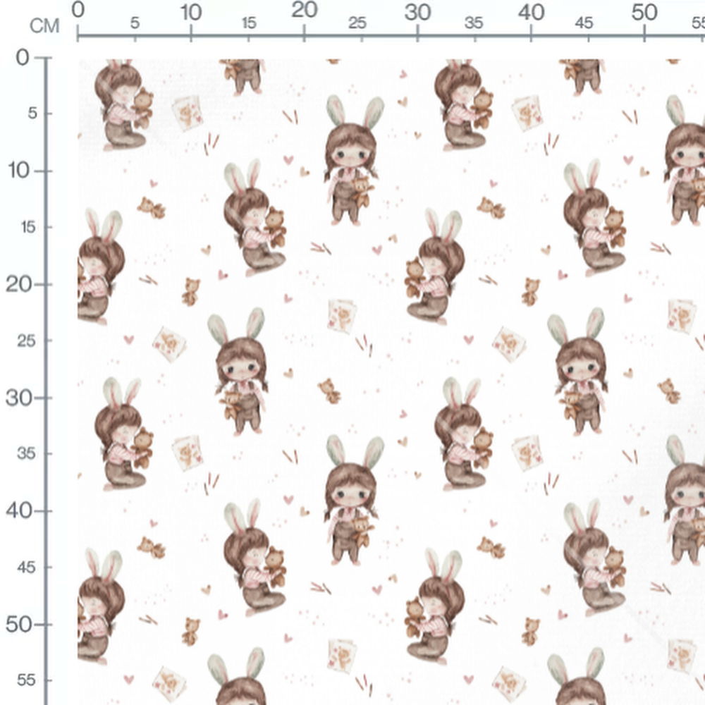 Les enfants portent des vêtements rayés et tiennent des ours en peluche. Des illustrations de cœurs et de dessins ajoutent une touche ludique au fond blanc. Les oreilles de lapin des enfants sont de couleur pastel.Les tissus