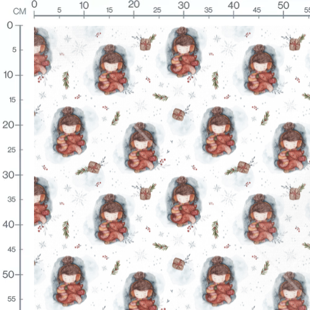 Les enfants portent des bonnets et des écharpes colorés. Les renards sont blottis contre les enfants. Des branches de sapin vertes et des petits cadeaux marron sont éparpillés. De petites baies rouges ajoutent une touche de couleur. Des flocons de neige subtils décorent le fond.Les tissus