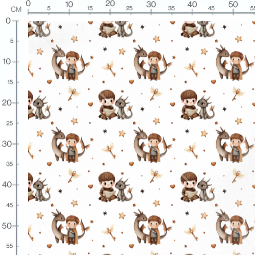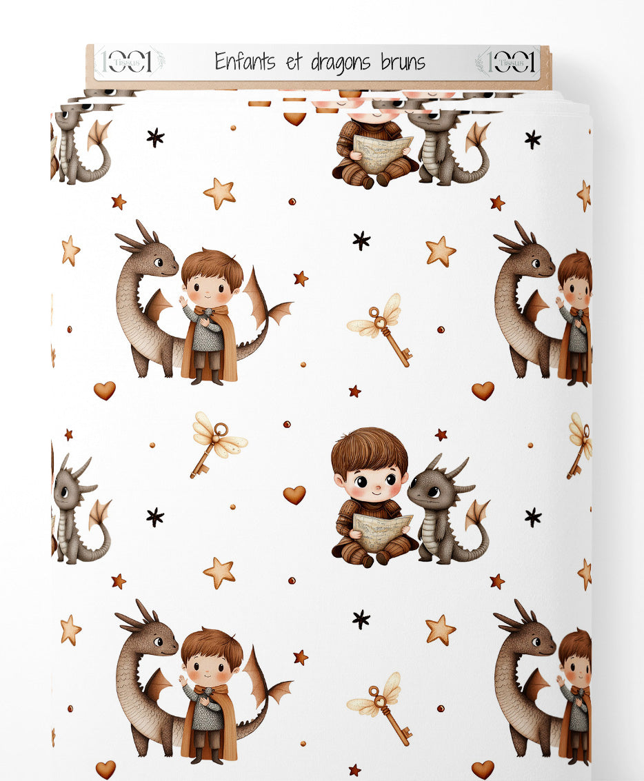 Les enfants portent des vêtements médiévaux. Les dragons sont petits et souriants. Des cœurs et des étoiles ajoutent une touche magique. Les clés ont des ailes délicates.Les tissus