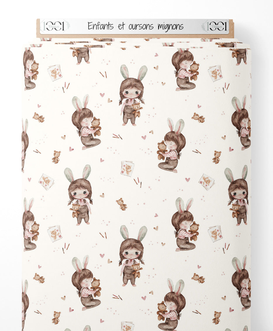 Les enfants portent des oreilles de lapin et tiennent des oursons bruns. De petits cœurs roses et des dessins d'oursons complètent le motif. Le fond est blanc avec des touches de couleur pastel.Les tissus