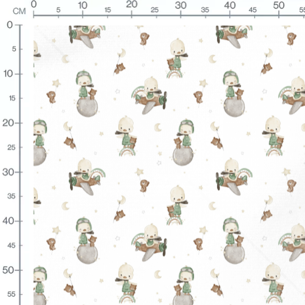 Les enfants portent des casques d'aviation et sont accompagnés d'oursons. Des avions volent parmi des lunes et des étoiles. Les couleurs principales sont beige et vert pastel.Les tissus