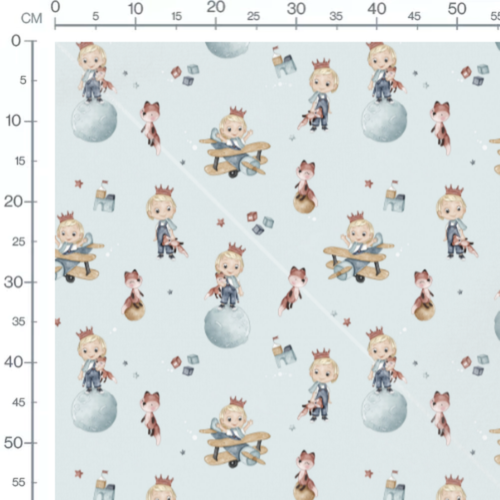 Les enfants portent des couronnes et tiennent des renards. Des avions en bois et des lunes grises complètent le motif. Des châteaux miniatures et des étoiles sont dispersés sur le fond.Les tissus