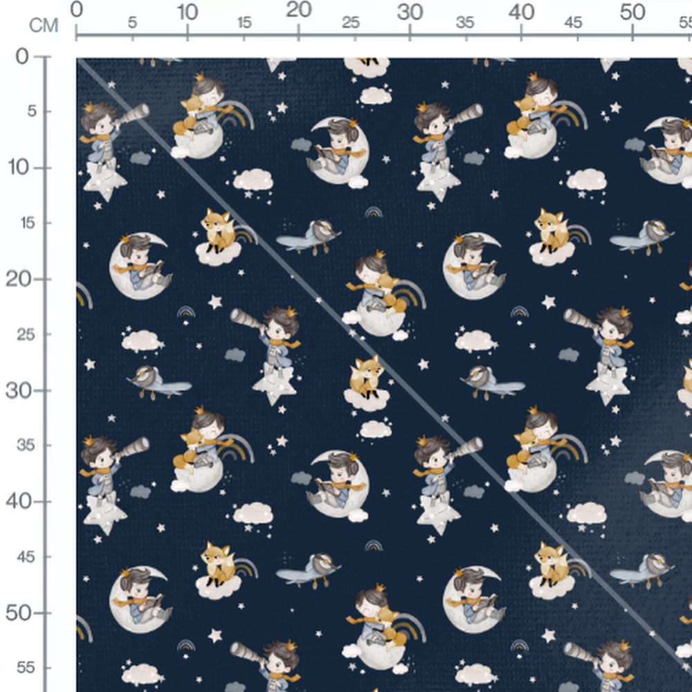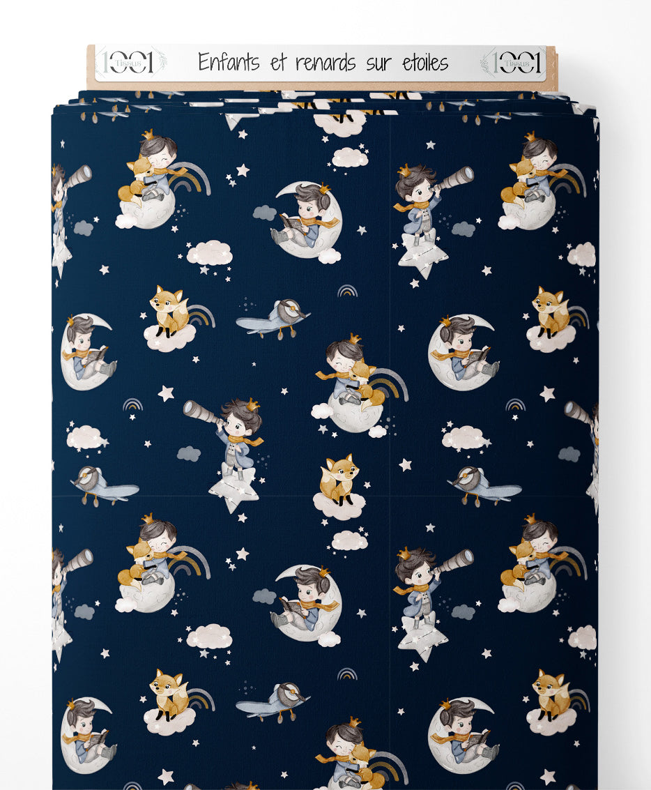 Les enfants portent des vêtements d'explorateur et tiennent des télescopes. Les renards sont assis sur des nuages et des arcs-en-ciel apparaissent en arrière-plan.Les tissus