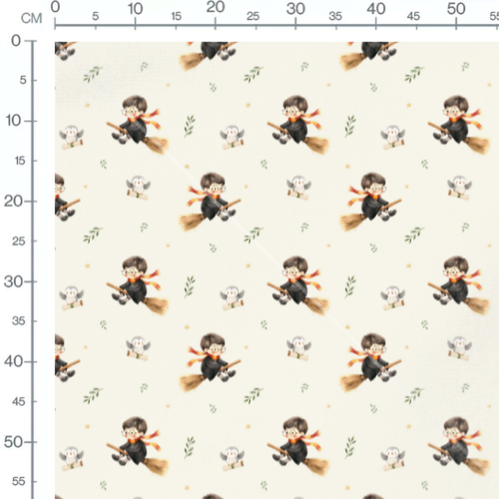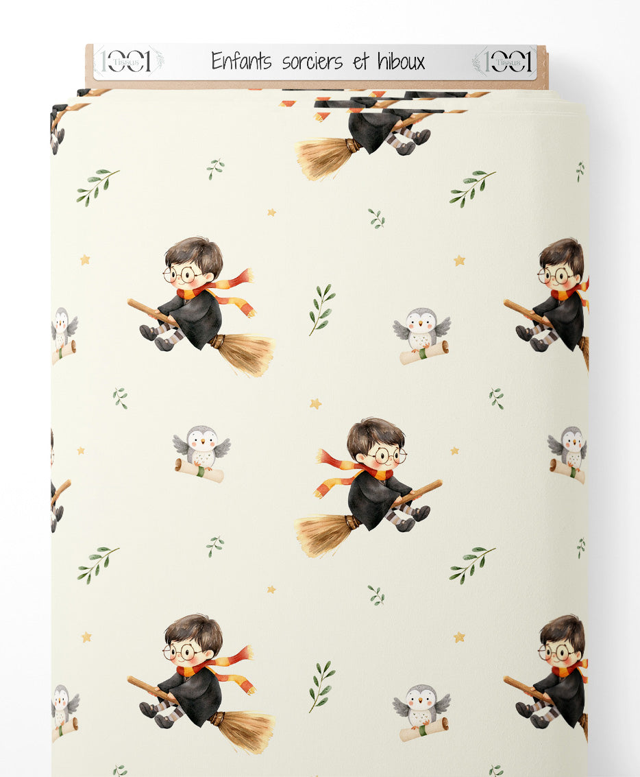 Les enfants portent des lunettes rondes et tiennent des balais en bois. Les hiboux sont posés sur des parchemins enroulés. De petites feuilles vertes et des étoiles dorées parsèment le fond.Les tissus
