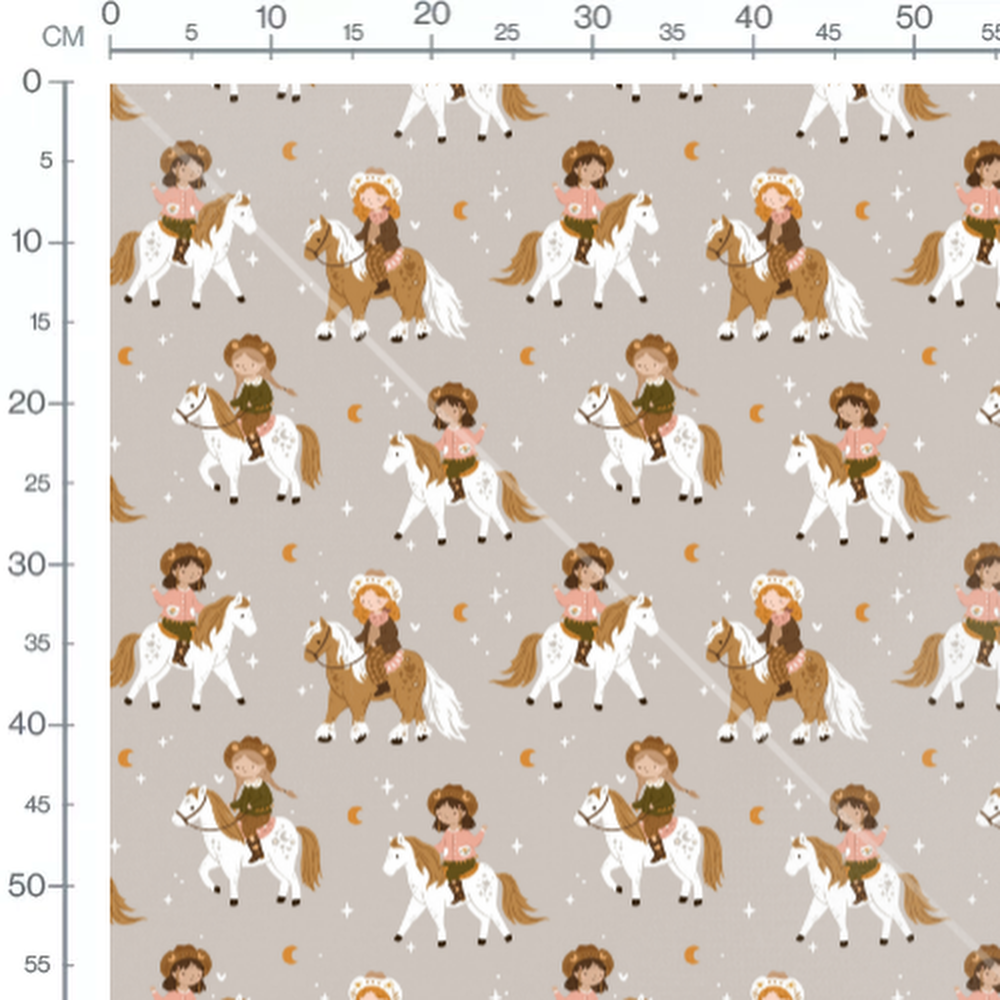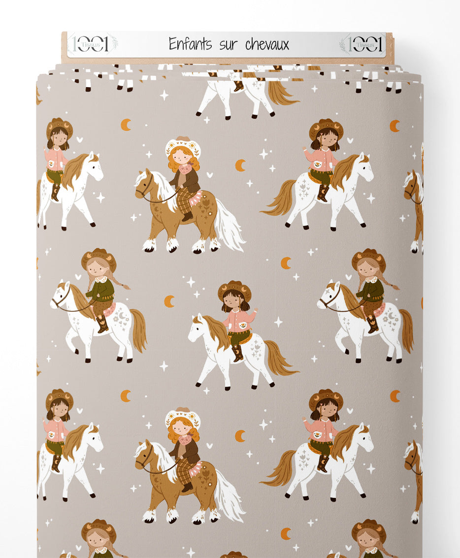 Les enfants portent des chapeaux et des vêtements colorés. Les chevaux ont des crinières blanches et brunes. Les motifs de lunes et d'étoiles ajoutent une touche céleste au fond beige.Les tissus