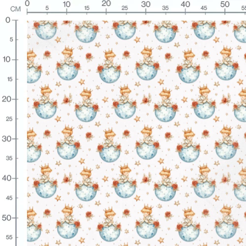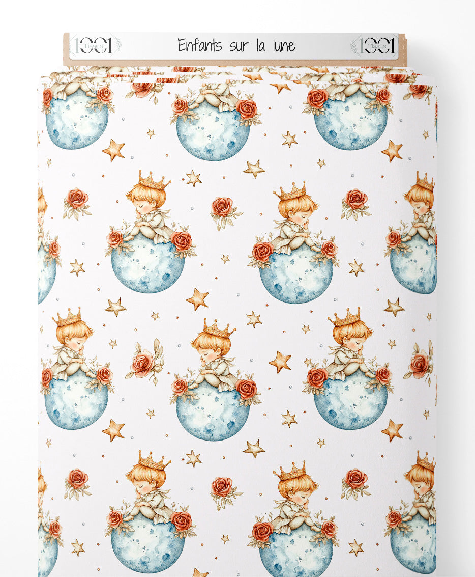 Les enfants portent des couronnes dorées et sont assis sur des lunes bleues. Des roses rouges et des étoiles dorées entourent les lunes. Le fond est blanc, créant un contraste doux avec les éléments colorés.Les tissus