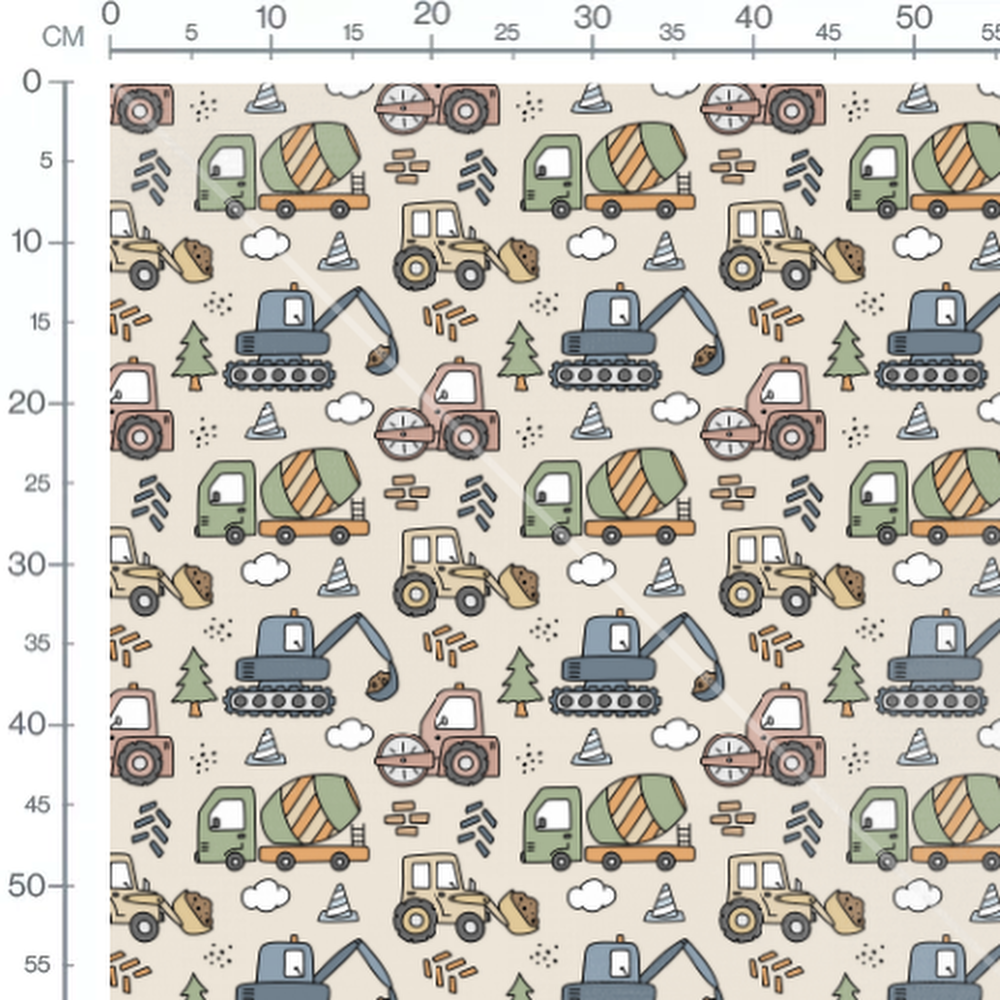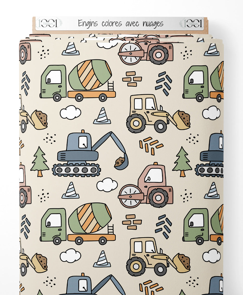 Camions, pelleteuses et bétonnières en vert, bleu et jaune. Petits détails comme des arbres et des briques ajoutent de la variété. Les motifs incluent également des éléments de construction comme des cônes et des nuages.Les tissus