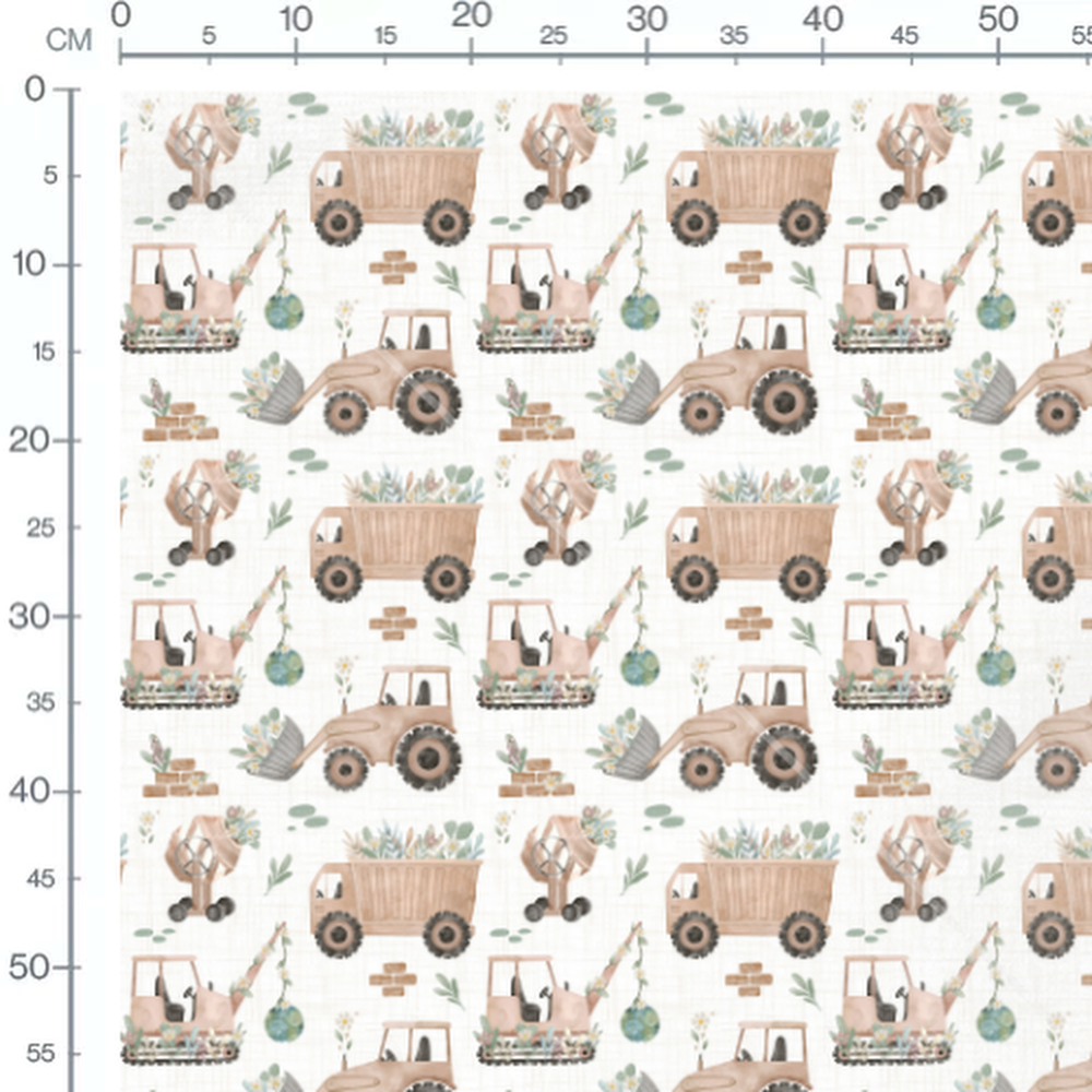 Les véhicules incluent des camions et des pelleteuses avec des motifs floraux. Les fleurs et feuillages ajoutent une touche de couleur verte et beige. Des briques marron et des feuilles vertes complètent le design.Les tissus