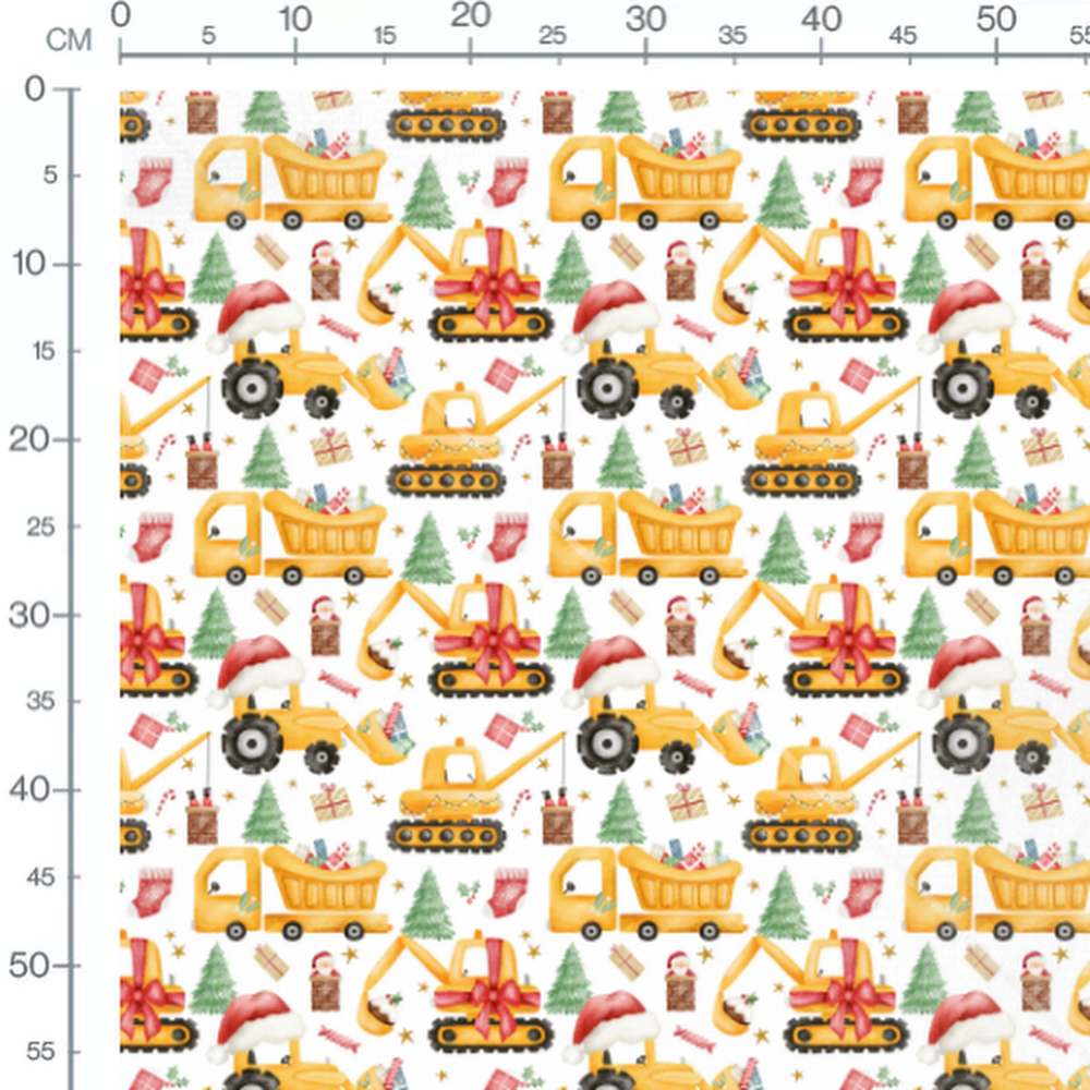Les engins de chantier portent des chapeaux de Noël rouges et blancs. Des sapins verts et des cadeaux multicolores sont dispersés autour. Des étoiles dorées ajoutent une touche festive. Des éléments comme des chaussettes rouges et des bonhommes de neige complètent le motif.Les tissus