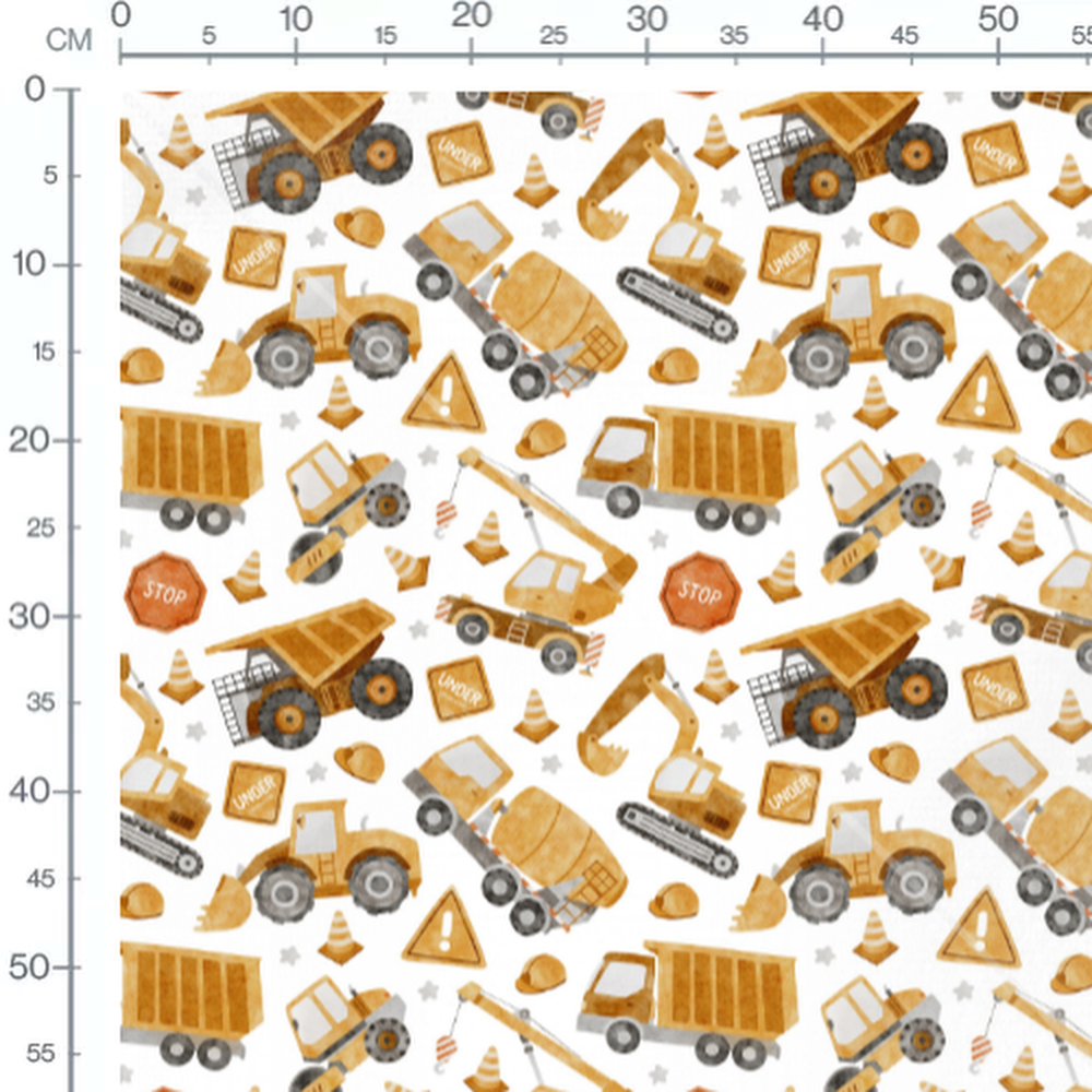 Camions-bennes, pelleteuses et grues illustrés en orange. Panneaux de signalisation et casques de chantier complètent le motif. Cônes de signalisation et étoiles grises ajoutent des détails. Les véhicules sont variés et incluent des bétonnières et des bulldozers.Les tissus