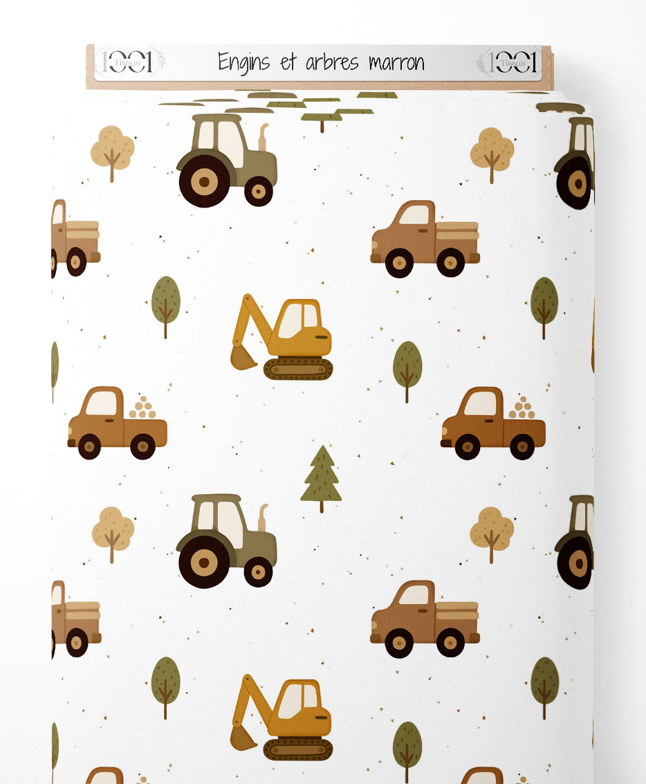 Les tracteurs sont de couleur marron foncé avec des détails noirs. Les camions sont marron clair avec des chargements de pierres. Les arbres sont de différentes nuances de vert et marron, ajoutant une touche naturelle au motif.Les tissus