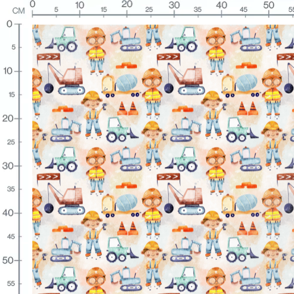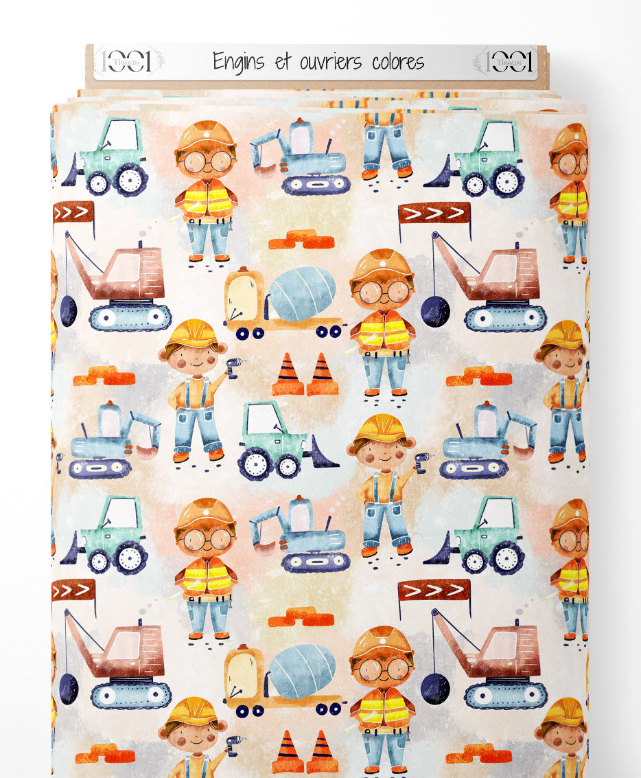 Les ouvriers portent des casques et des gilets de sécurité. Les engins incluent des pelleteuses et des bétonnières. Les cônes de signalisation sont orange et les briques sont dispersées. Le fond beige ajoute une touche douce au motif.Les tissus