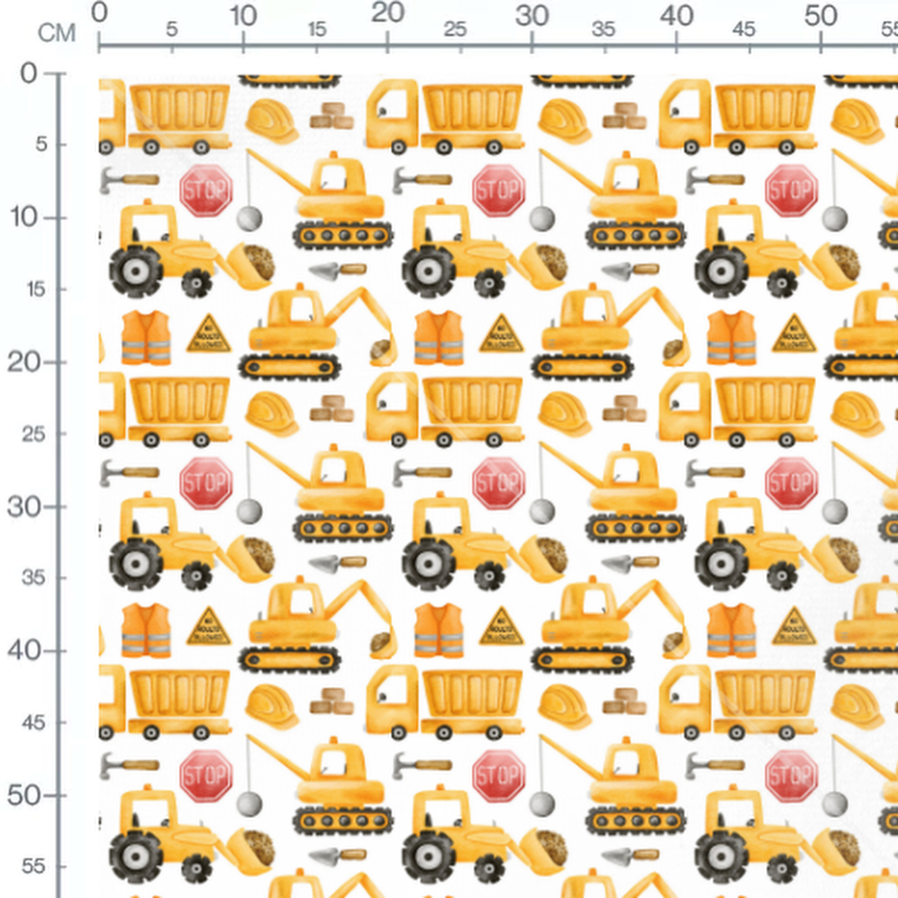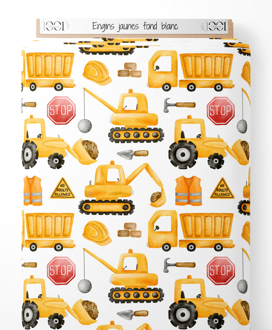 Tissu - Engins jaunes sur fond blanc