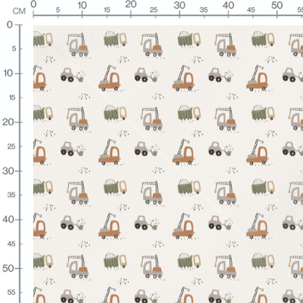 Les véhicules incluent des grues et des camions avec des détails simplifiés. Les couleurs principales sont le marron, le gris et le vert kaki.Les tissus
