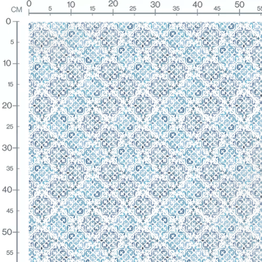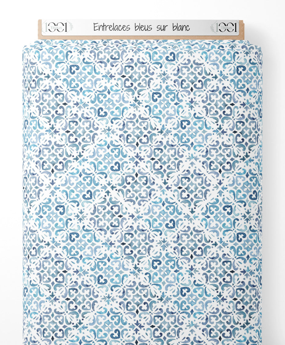 Les motifs entrelacés présentent des formes géométriques complexes. Les nuances de bleu varient du clair au foncé, créant un effet visuel harmonieux.Les tissus