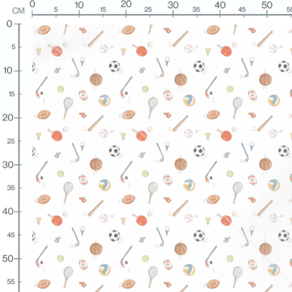 Ballons de football, basketball et rugby en couleurs variées. Raquettes de tennis et ping-pong avec détails réalistes. Sifflets et bâtons de golf ajoutent une touche sportive.Les tissus