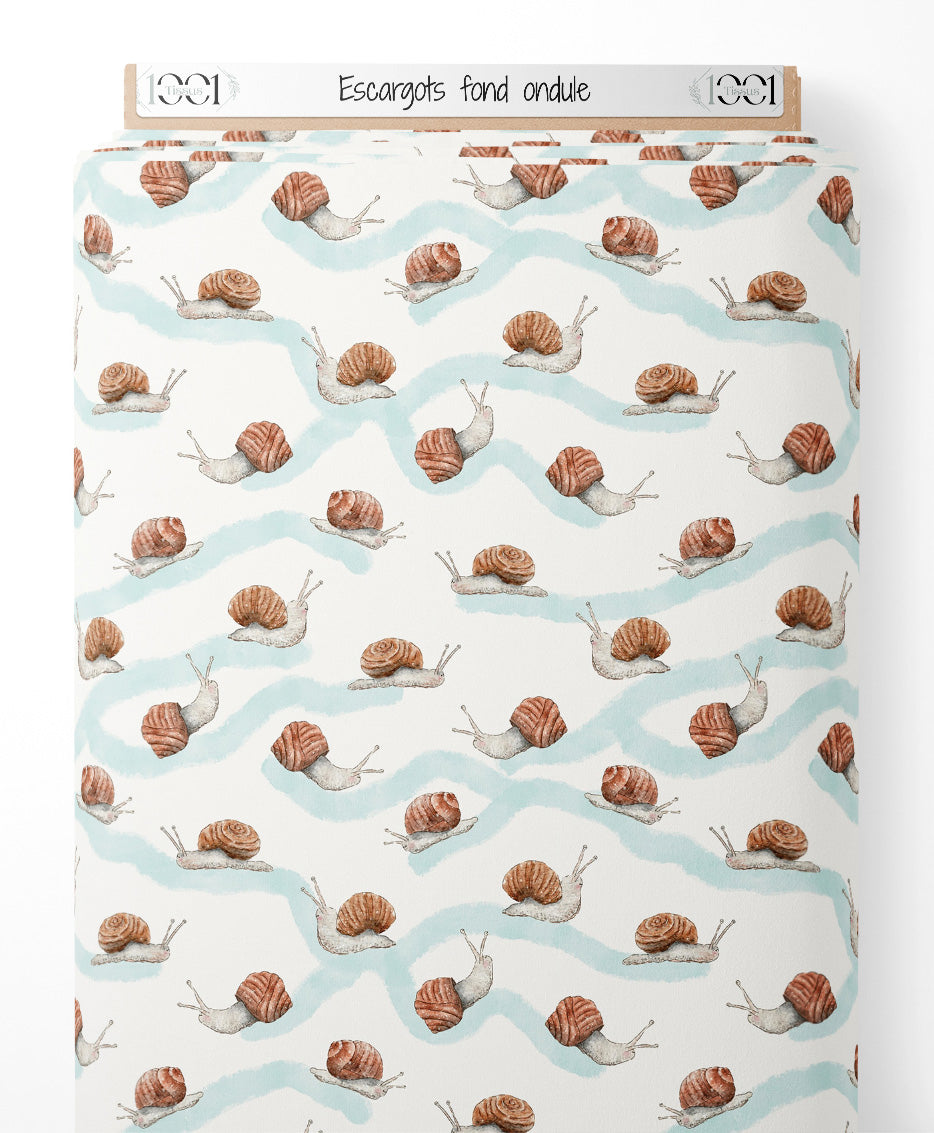 Les escargots sont dessinés avec des détails réalistes. Le fond blanc est agrémenté de lignes ondulées bleu clair qui ajoutent une touche de mouvement.Les tissus