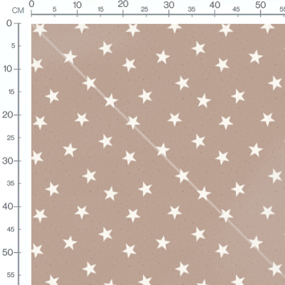 Les étoiles blanches sont uniformément réparties sur le fond beige. De petits points noirs ajoutent une texture subtile au motif.Les tissus