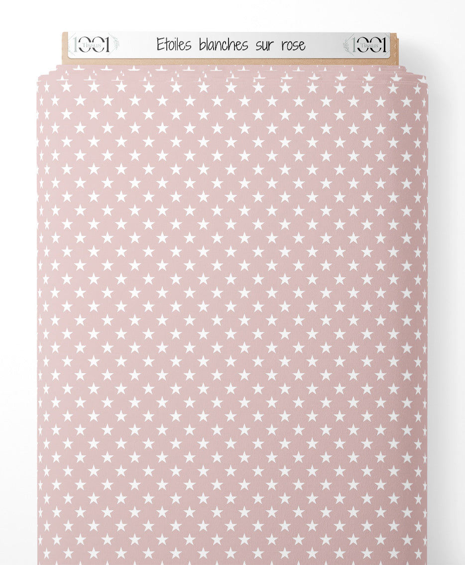 Les étoiles sont de taille uniforme et réparties régulièrement. Le fond rose pâle crée un contraste doux avec les étoiles blanches.Les tissus