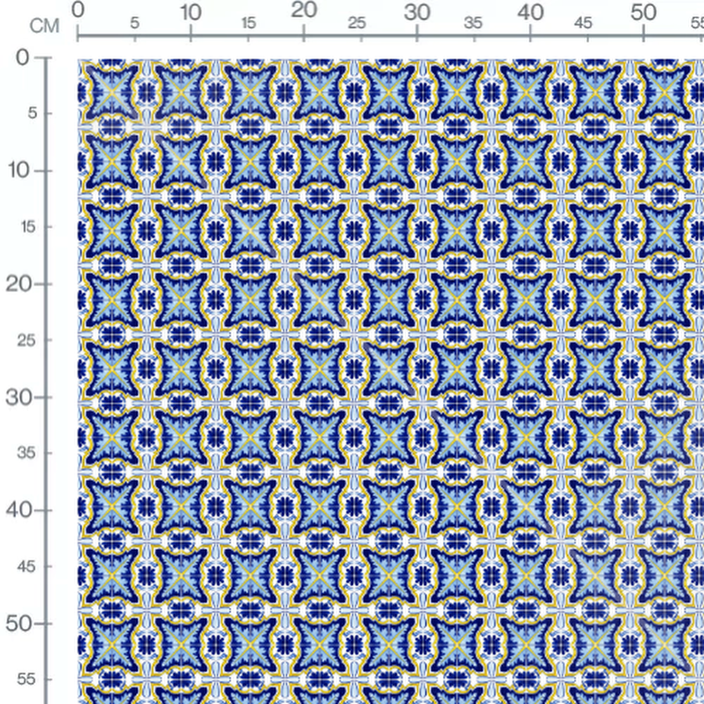 Les étoiles sont entourées de formes géométriques bleues et jaunes. Les motifs rappellent des carreaux traditionnels avec une répétition régulière.Les tissus
