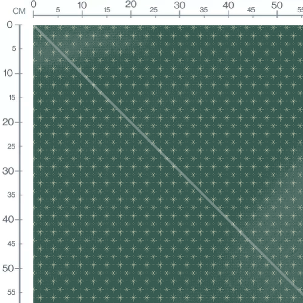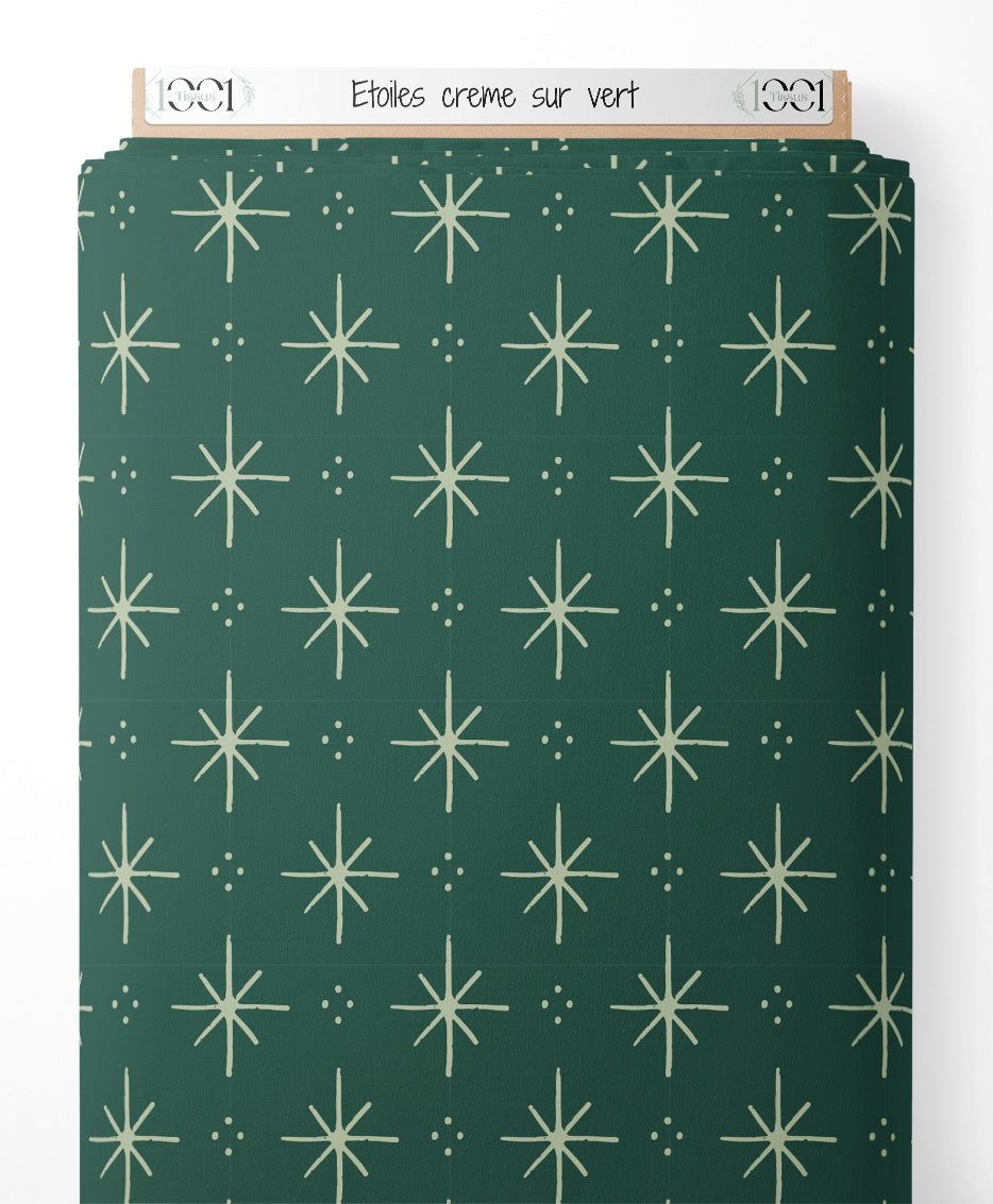 Les étoiles sont dessinées avec des lignes simples et épurées. Le fond vert foncé met en valeur les motifs crème. Les petits points ajoutent une touche de dynamisme au motif.Les tissus