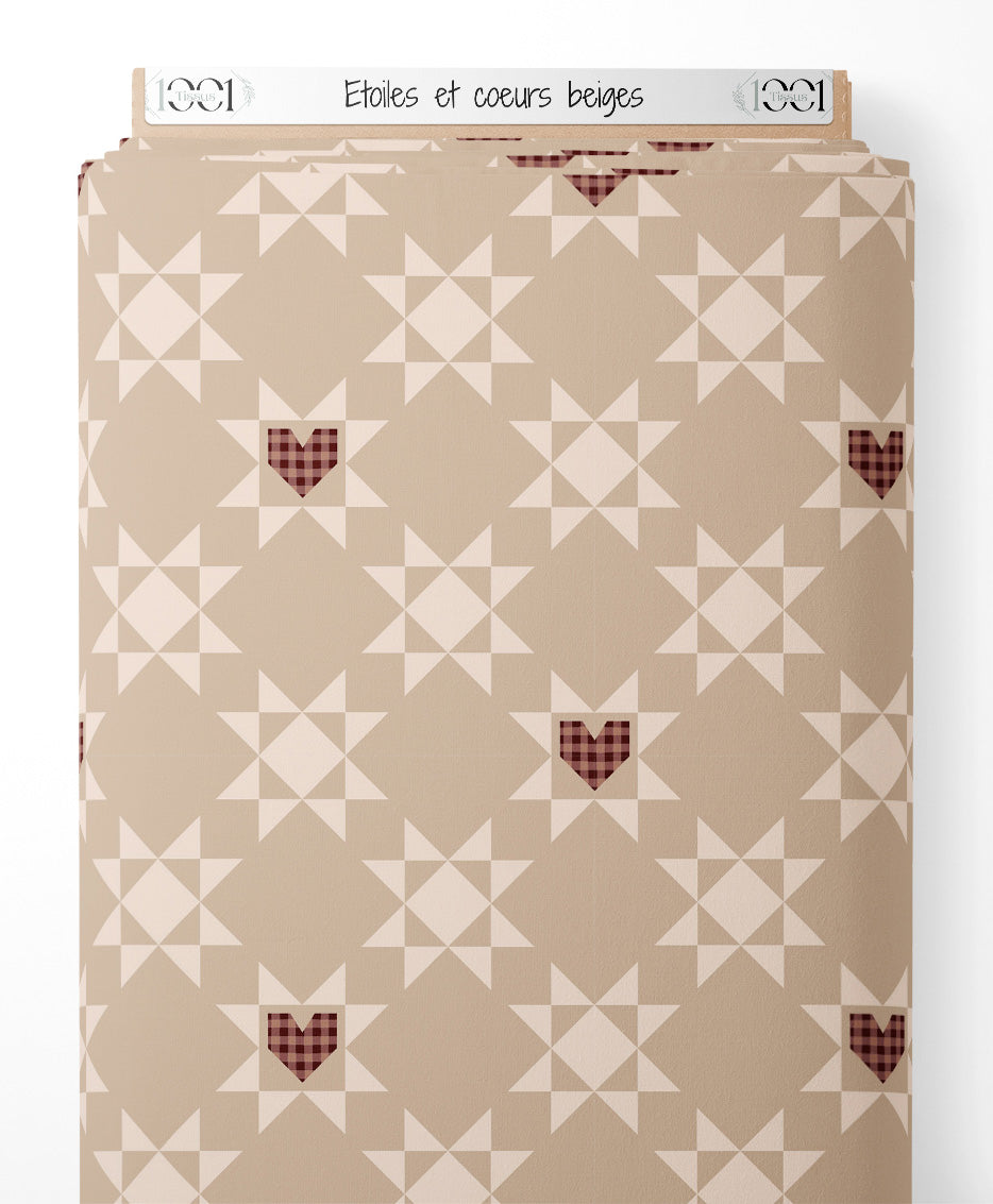 Les étoiles sont composées de triangles et de carrés. Les cœurs au centre des étoiles sont à motifs à carreaux marron.Les tissus