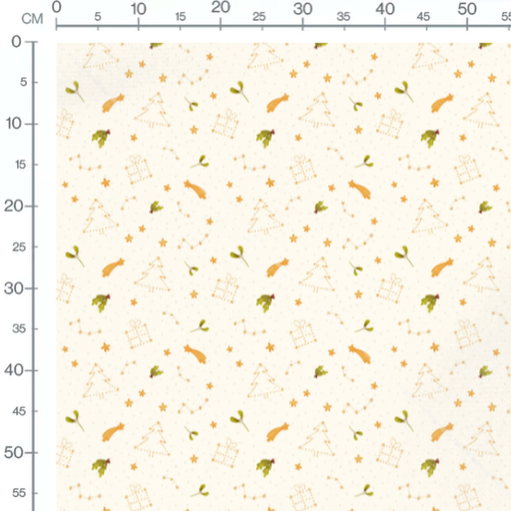 Petites étoiles dorées dispersées sur le fond. Branches de gui avec des baies rouges. Arbres de Noël stylisés en pointillés dorés. Comètes dorées ajoutant une touche festive.Les tissus