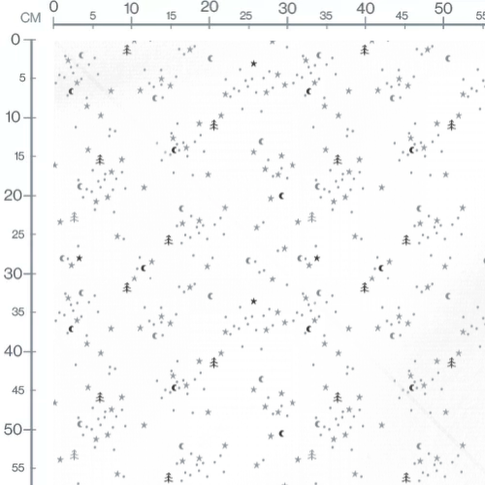 Les étoiles et les lunes sont de différentes tailles. Les sapins noirs ajoutent une touche de nature au motif. Les éléments sont espacés de manière aléatoire.Les tissus