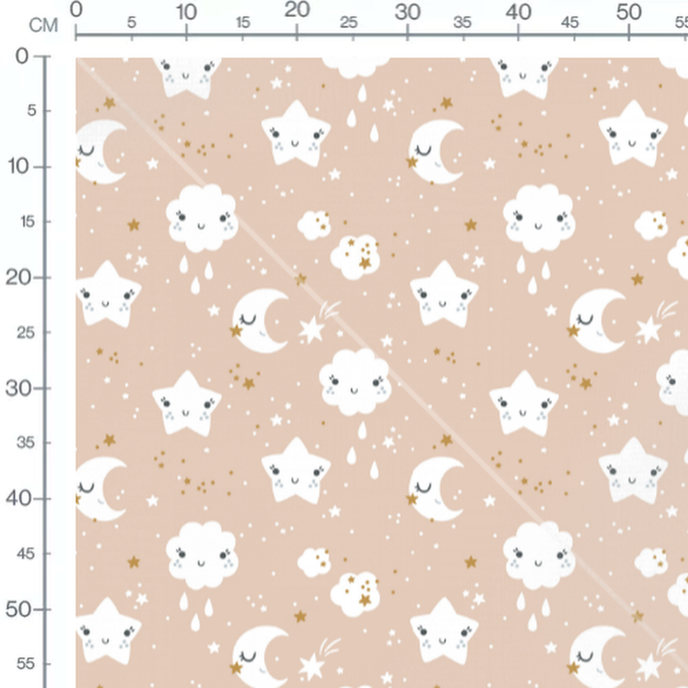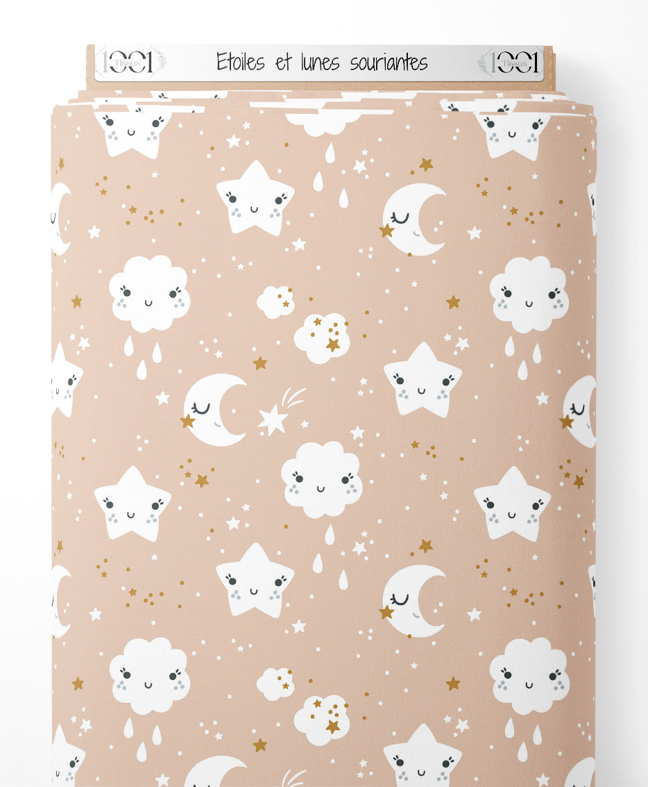 Les étoiles et les lunes arborent des visages souriants. De petites gouttes blanches et des étoiles dorées complètent le motif.Les tissus