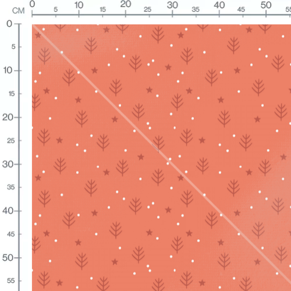 Les sapins sont stylisés et uniformes. Les étoiles sont de taille moyenne et régulières. Les points blancs rappellent des flocons de neige.Les tissus