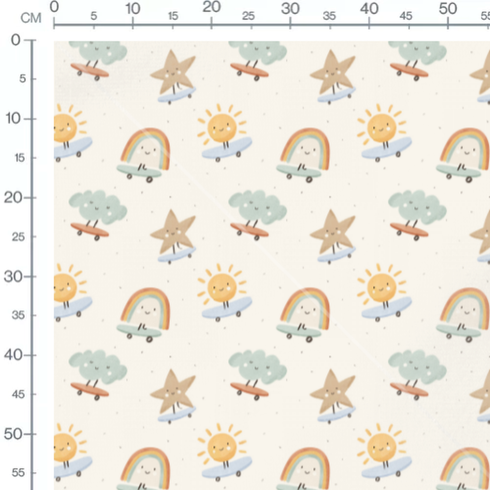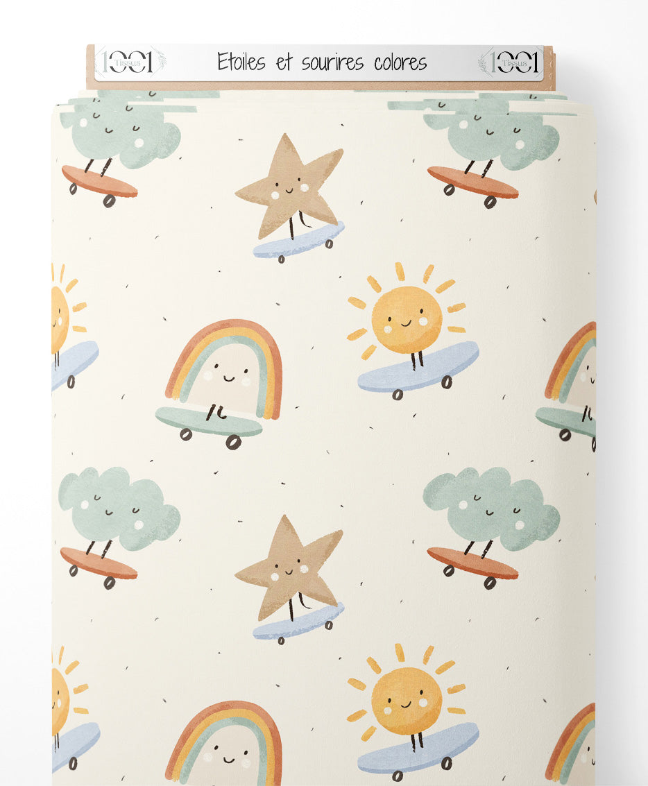 Les étoiles et nuages sont accompagnés de petits sourires. Les soleils rayonnent avec des teintes jaunes et oranges. Les arcs-en-ciel ajoutent une touche de couleur vive avec des bandes multicolores.Les tissus