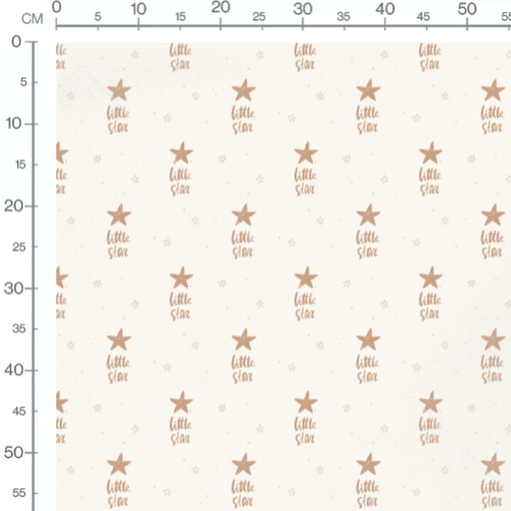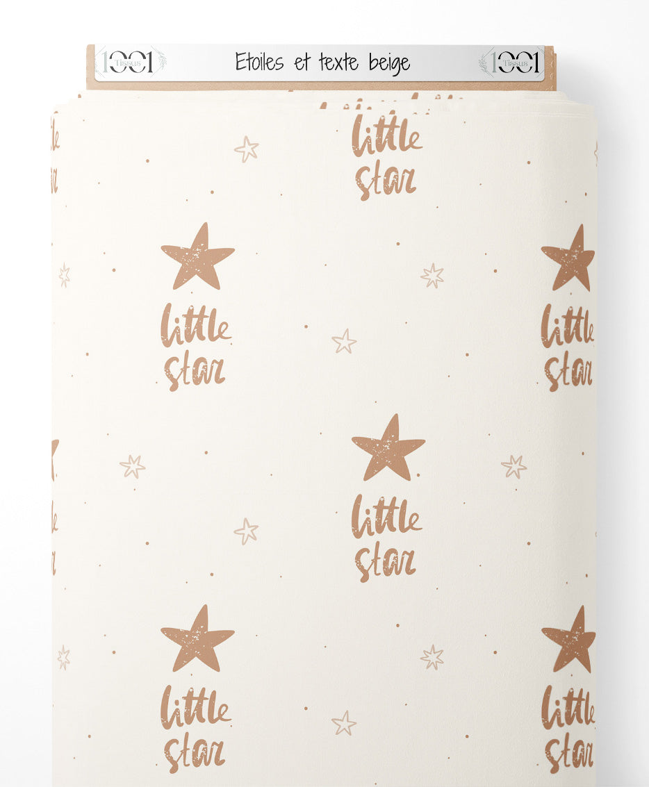 Le motif inclut des étoiles de différentes tailles et des inscriptions 'little star'. Les étoiles sont de couleur beige avec quelques points épars. Le fond est d'une teinte crème douce.Les tissus
