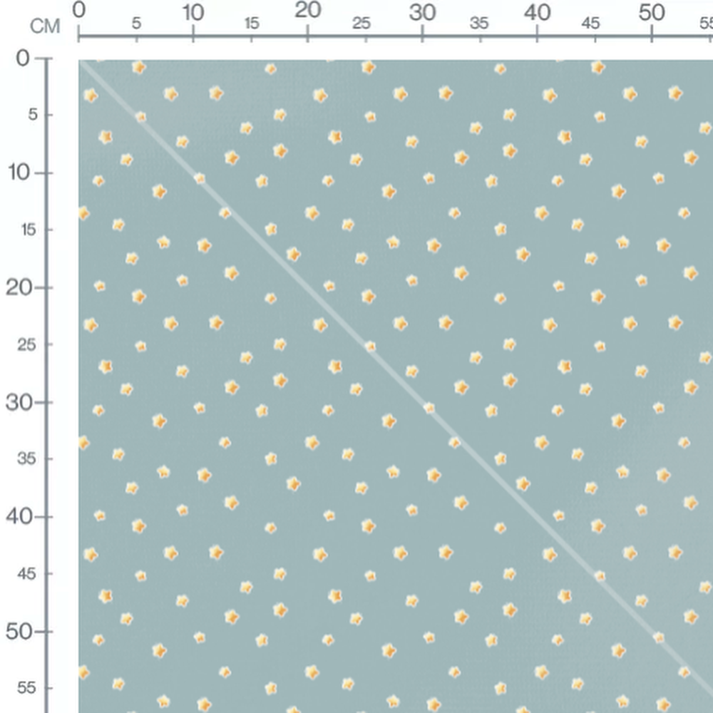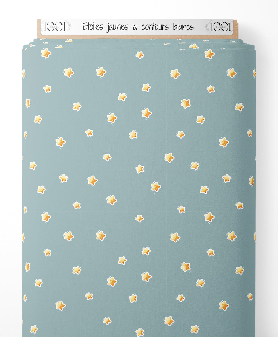 Les étoiles sont de couleur jaune avec des contours blancs distincts. Le fond bleu crée un contraste doux avec les motifs étoilés.Les tissus