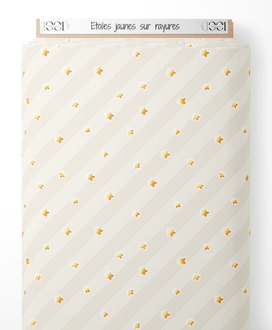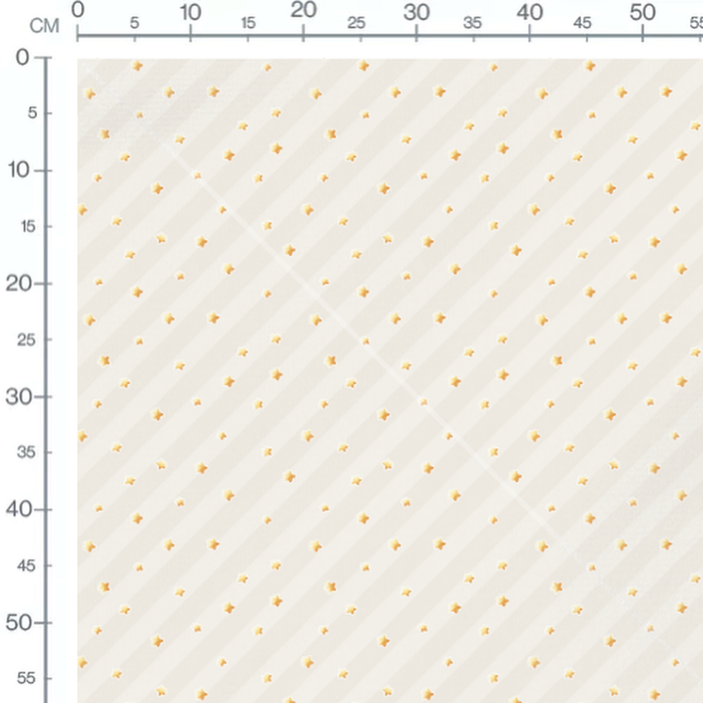 Les étoiles sont de différentes tailles et dispersées uniformément. Le fond présente des rayures diagonales alternant entre le beige et le blanc.Les tissus
