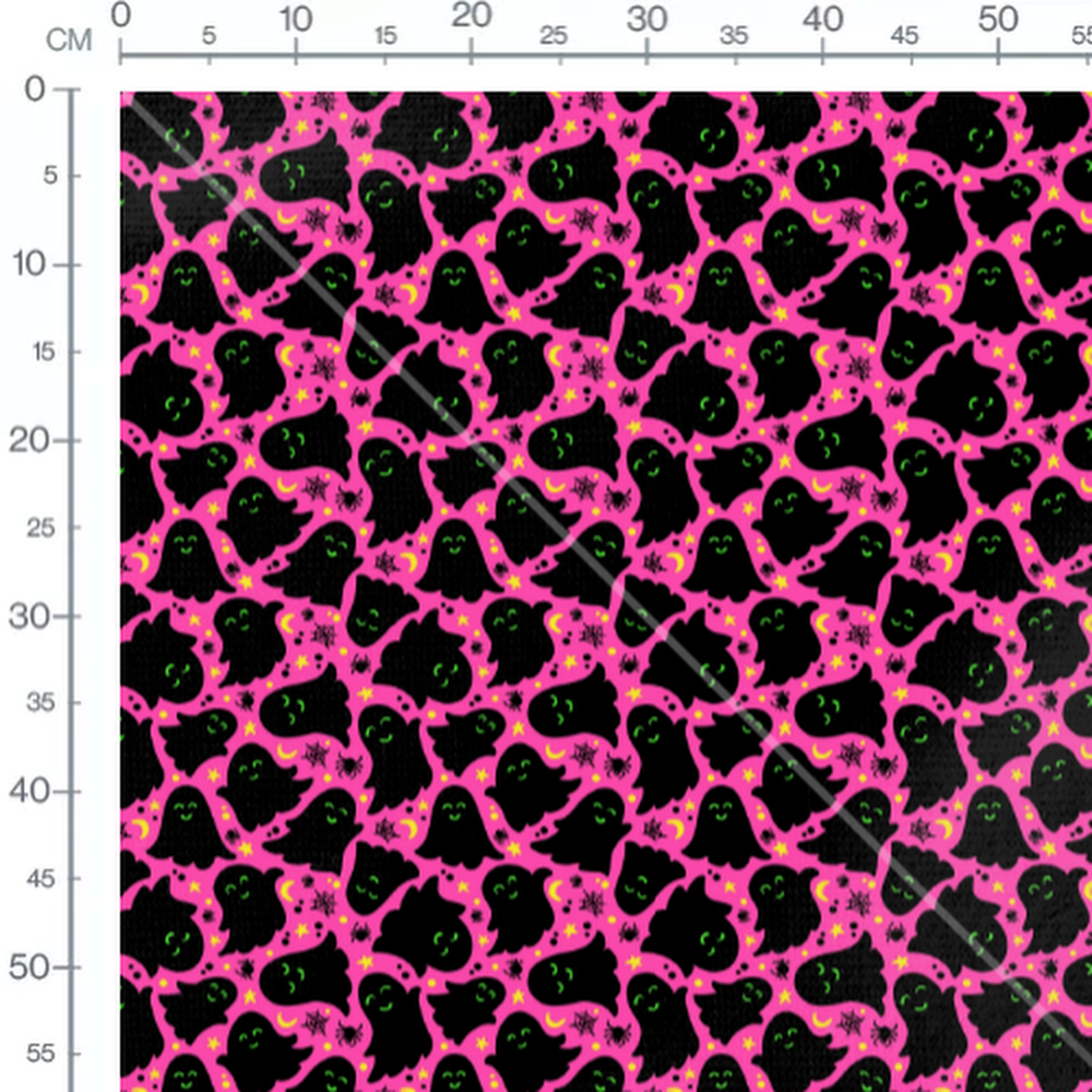 Des étoiles jaunes et des toiles d'araignée noires ajoutent des détails au fond rose. Les fantômes ont des expressions joyeuses et sont entourés de petits éléments décoratifs. Les lunes jaunes apportent une touche lumineuse au motif.Les tissus