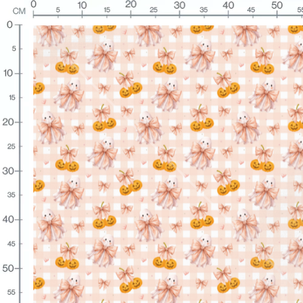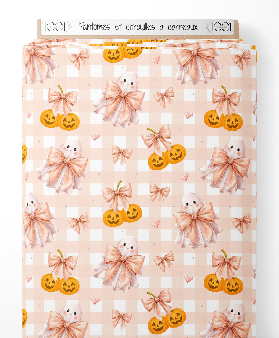 Les fantômes portent de grands nœuds roses. Les citrouilles ont des visages souriants et sont de couleur orange vif. De petits cœurs roses ajoutent une touche de douceur au motif. Le fond est à carreaux dans des tons pastel.Les tissus
