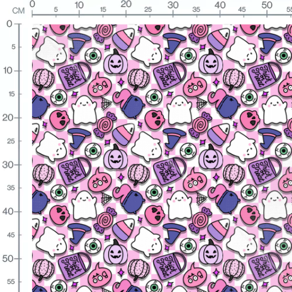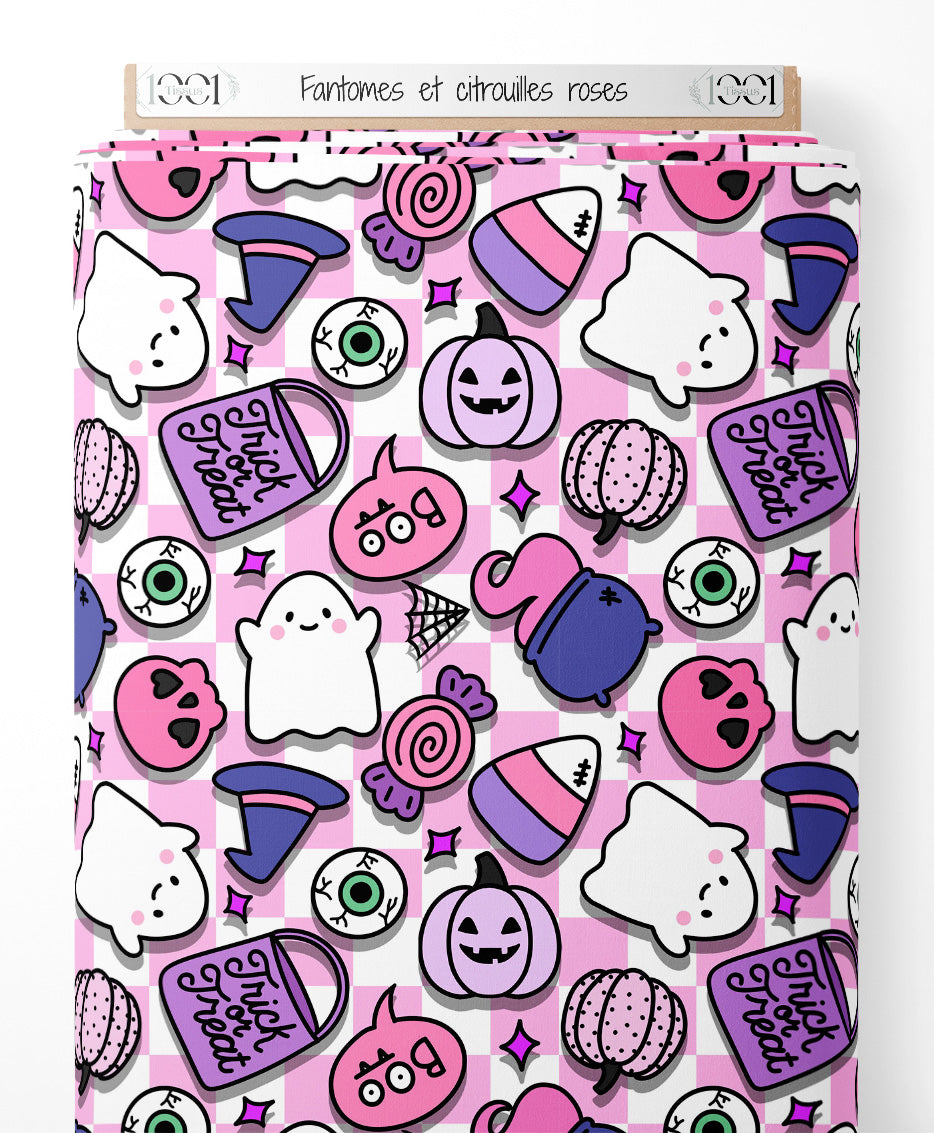 Petits sacs avec inscription 'Trick or Treat' et toiles d'araignée noires complètent le thème. Étoiles violettes et bonbons en spirale ajoutent des détails amusants. Les éléments sont entourés de contours noirs pour un effet cartoon.Les tissus