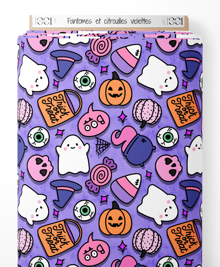 Chapeaux de sorcière et sacs 'Trick or Treat' ajoutent une touche festive. Toiles d'araignée et étoiles violettes décorent le fond. Les bonbons et les yeux apportent une ambiance ludique.Les tissus