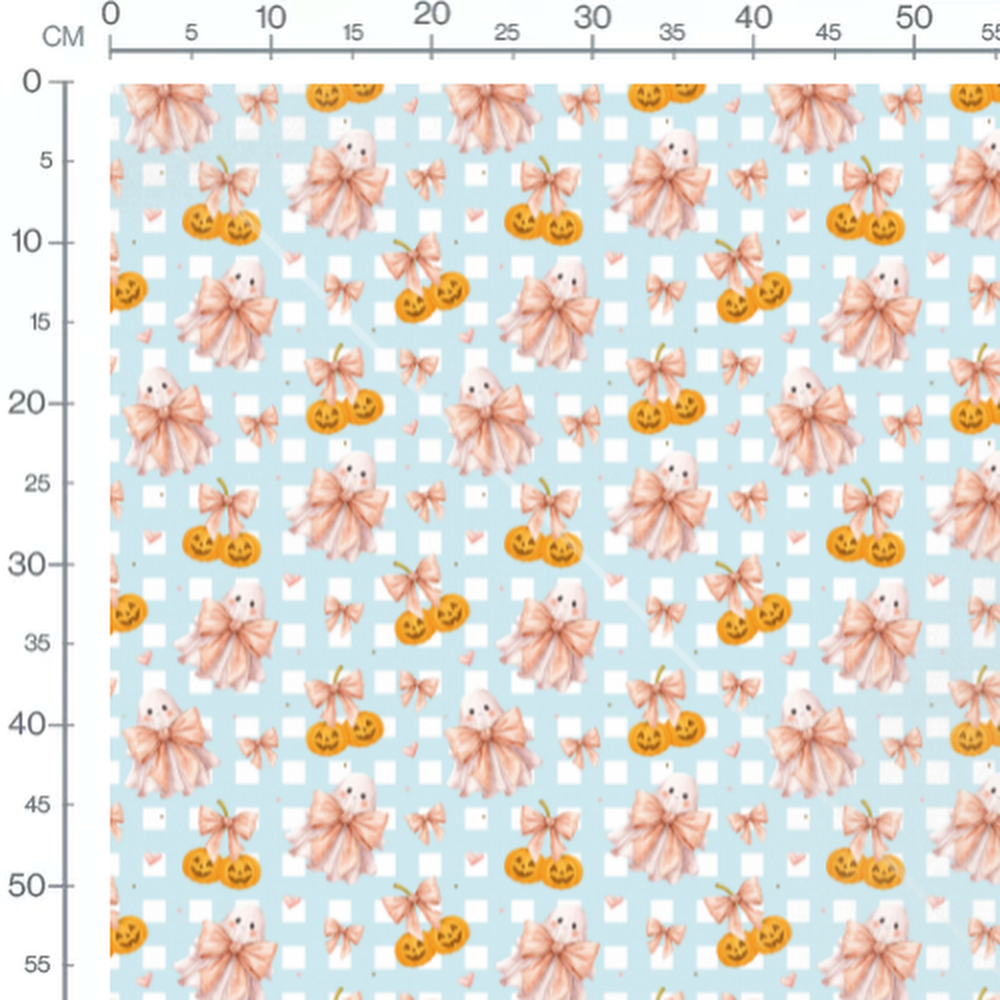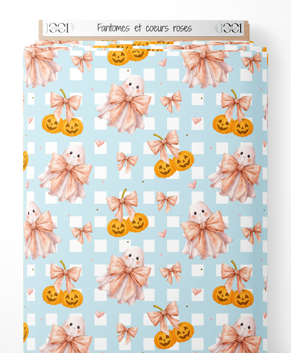 Les fantômes sont ornés de grands nœuds roses. Les citrouilles affichent des visages souriants. De petits cœurs roses ajoutent une touche de douceur au design. Le fond bleu est parsemé de carreaux blancs pour un effet graphique.Les tissus