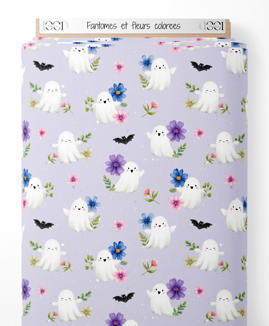Les fantômes blancs sont accompagnés de petites chauves-souris noires. Les fleurs sont de différentes couleurs, incluant des nuances de rose, bleu et violet. Le fond violet est parsemé de petites étoiles blanches.Les tissus