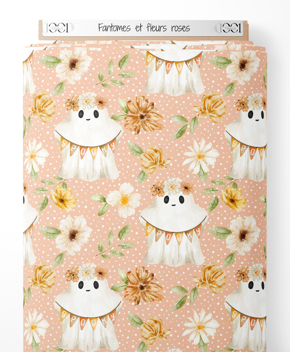 Les fantômes portent des guirlandes avec le mot 'spooky'. Les fleurs sont entourées de petites feuilles vertes. Le fond rose est parsemé de petits pois blancs.Les tissus