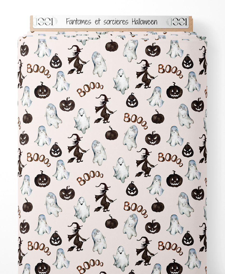 Les fantômes ont des expressions variées et sont accompagnés de sorcières sur balais. Les citrouilles sont sculptées avec des visages effrayants. Le texte 'Boooo' ajoute une touche ludique au motif.Les tissus