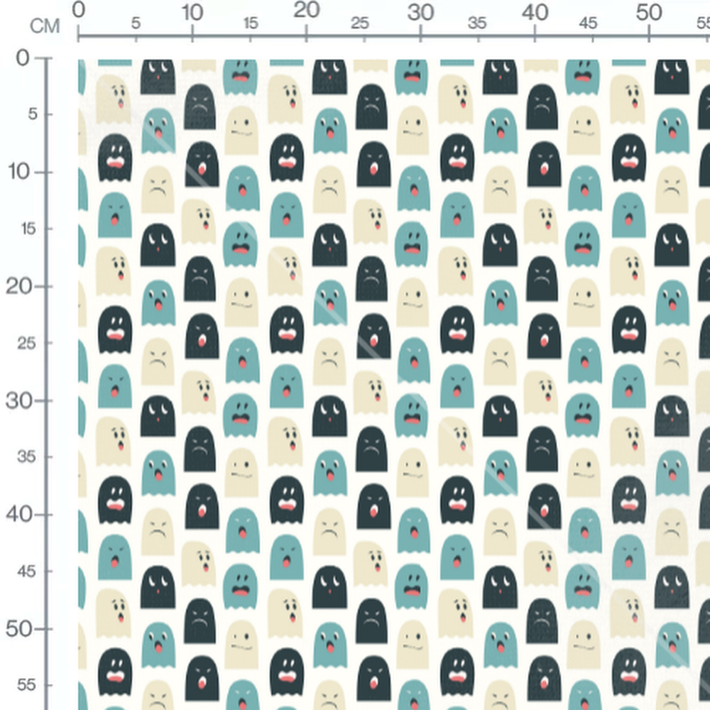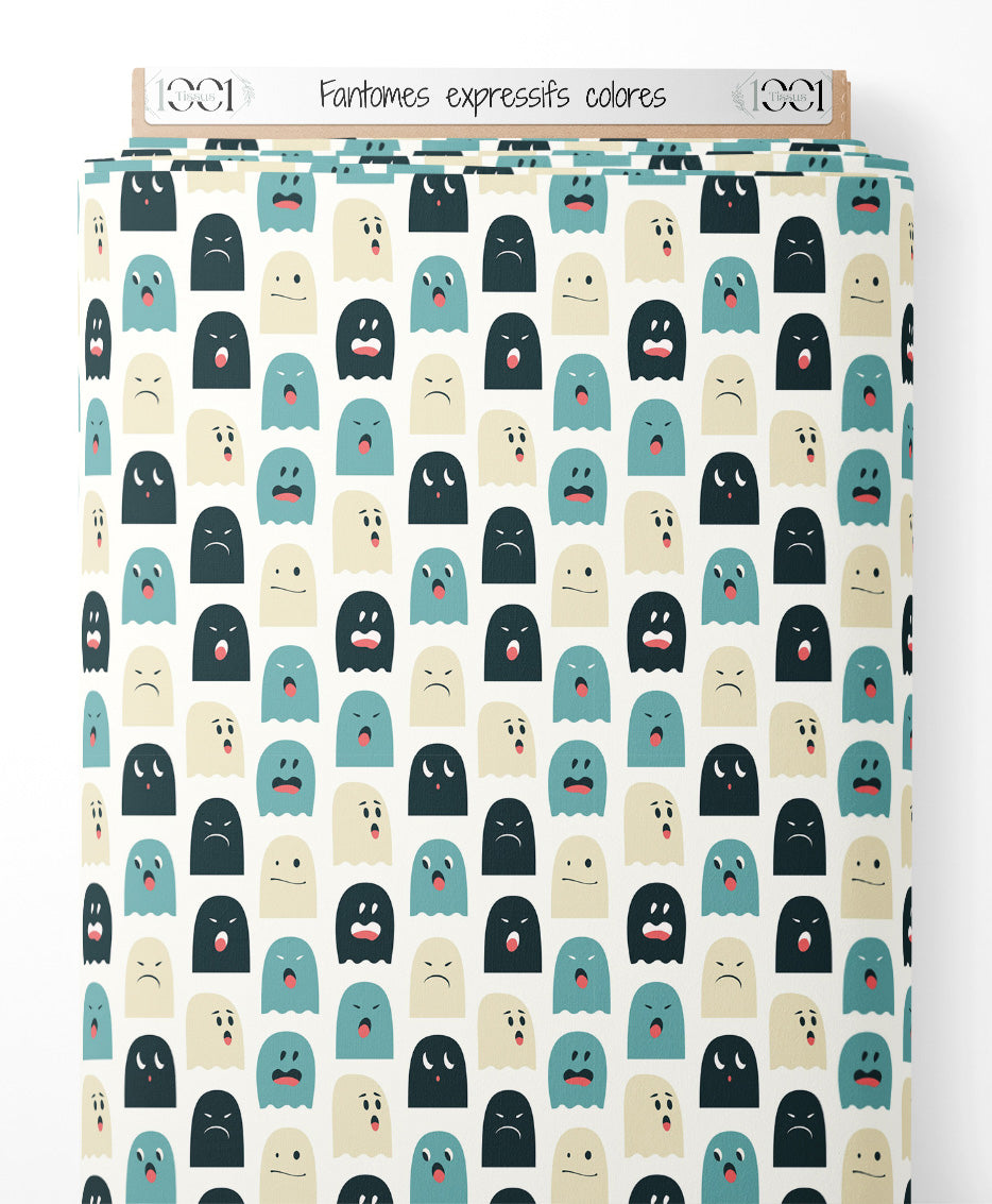 Les fantômes présentent des expressions faciales variées, allant de la surprise à la tristesse. Les couleurs principales sont le bleu, le noir et le beige, ajoutant une touche ludique au motif. Chaque fantôme a une expression unique, créant un ensemble dynamique et amusant.Les tissus