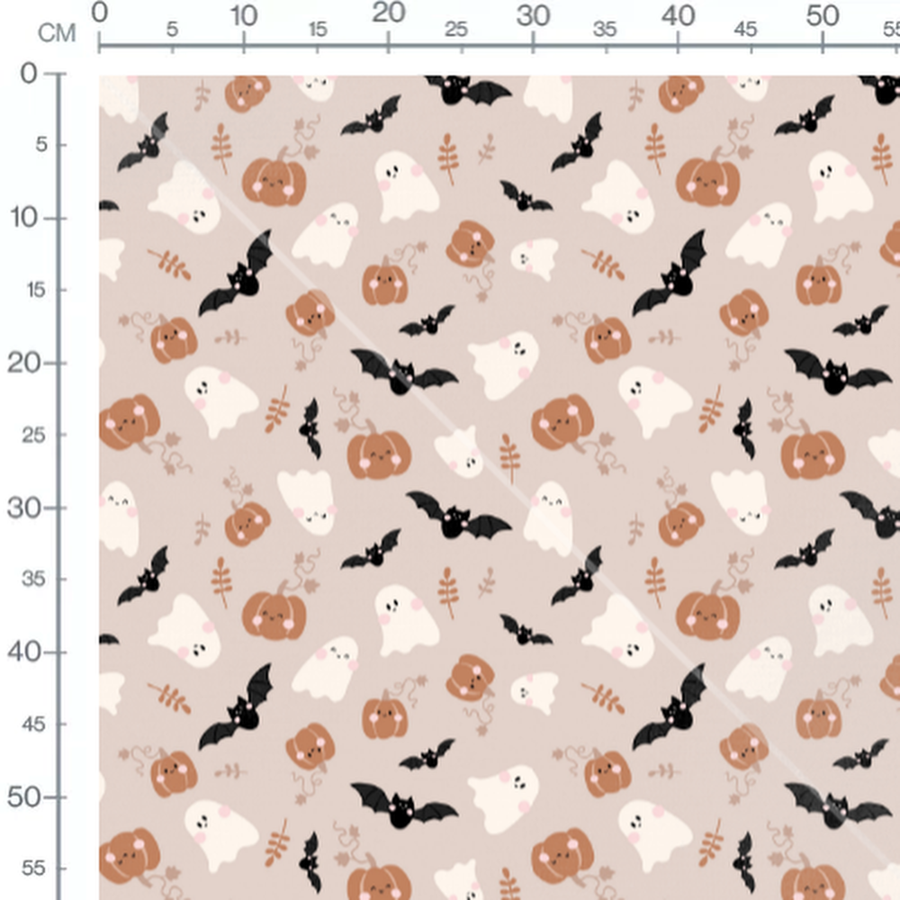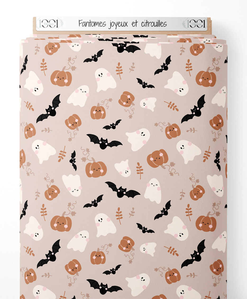 Les fantômes ont des joues roses et des expressions joyeuses. Les citrouilles sont décorées de petites vrilles. Les chauves-souris sont dispersées parmi des feuilles stylisées.Les tissus