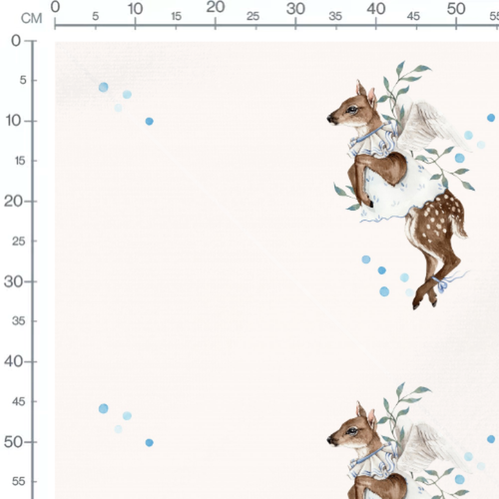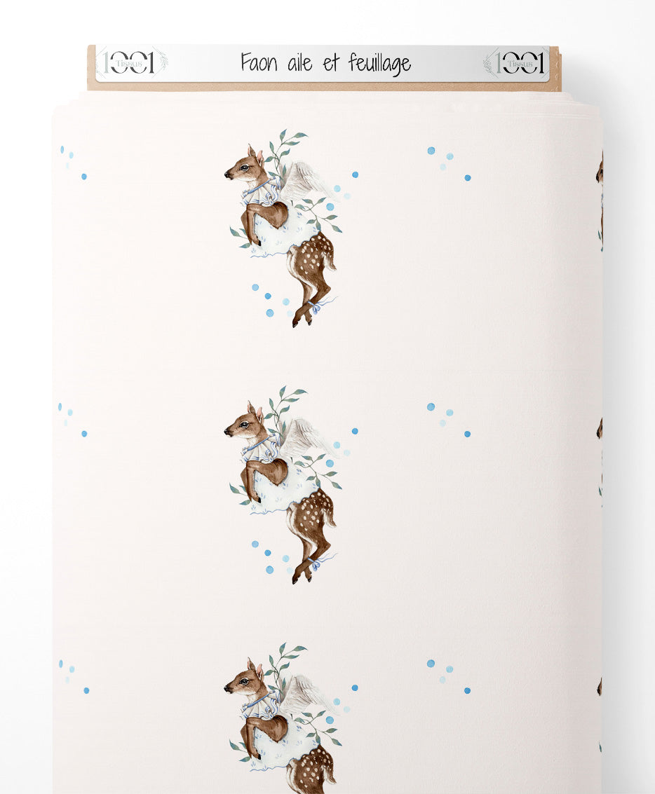 Le faon porte des ailes blanches et un collier bleu. Des feuilles vertes entourent l'animal, ajoutant une touche naturelle. Des points bleus dispersés complètent le motif.Les tissus